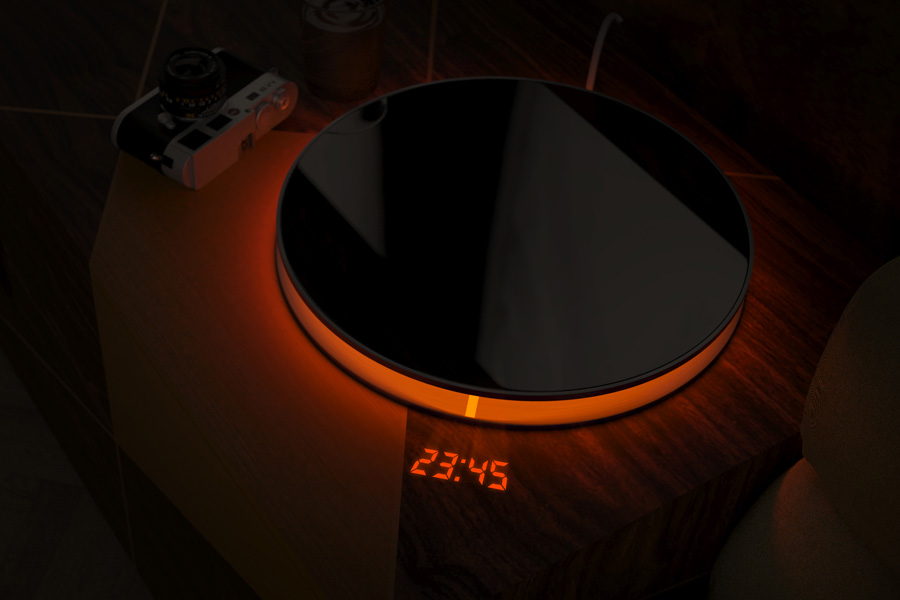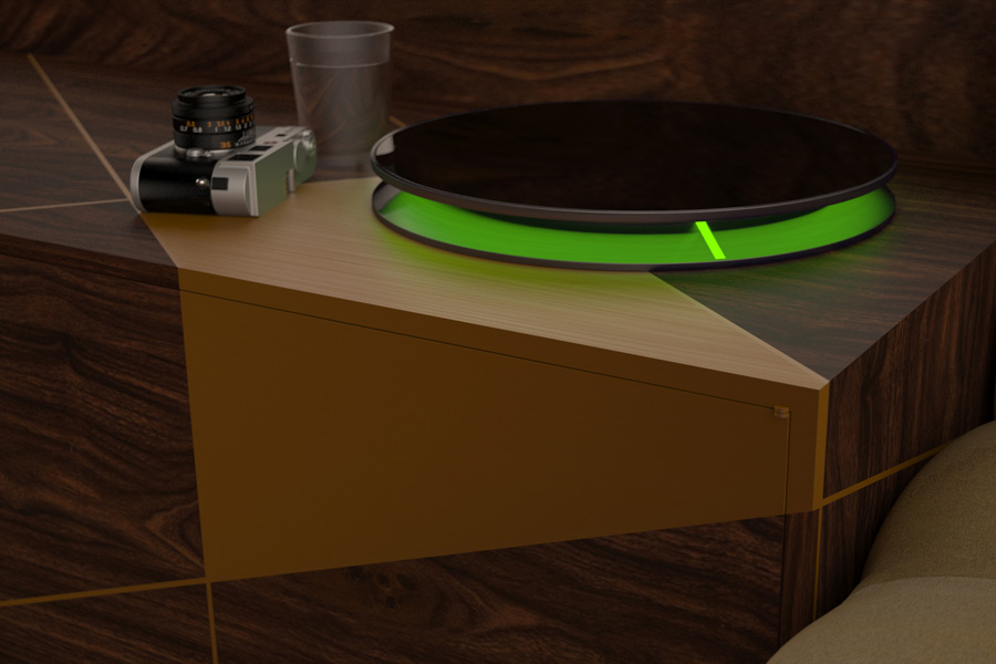 Materials: dark brushed steel, polycarbonate, polished polymer for inductive charging, electrical equipment, dimmable LED strip, scratch-proof film; sizes 30Lx30Wx 5H (cm).