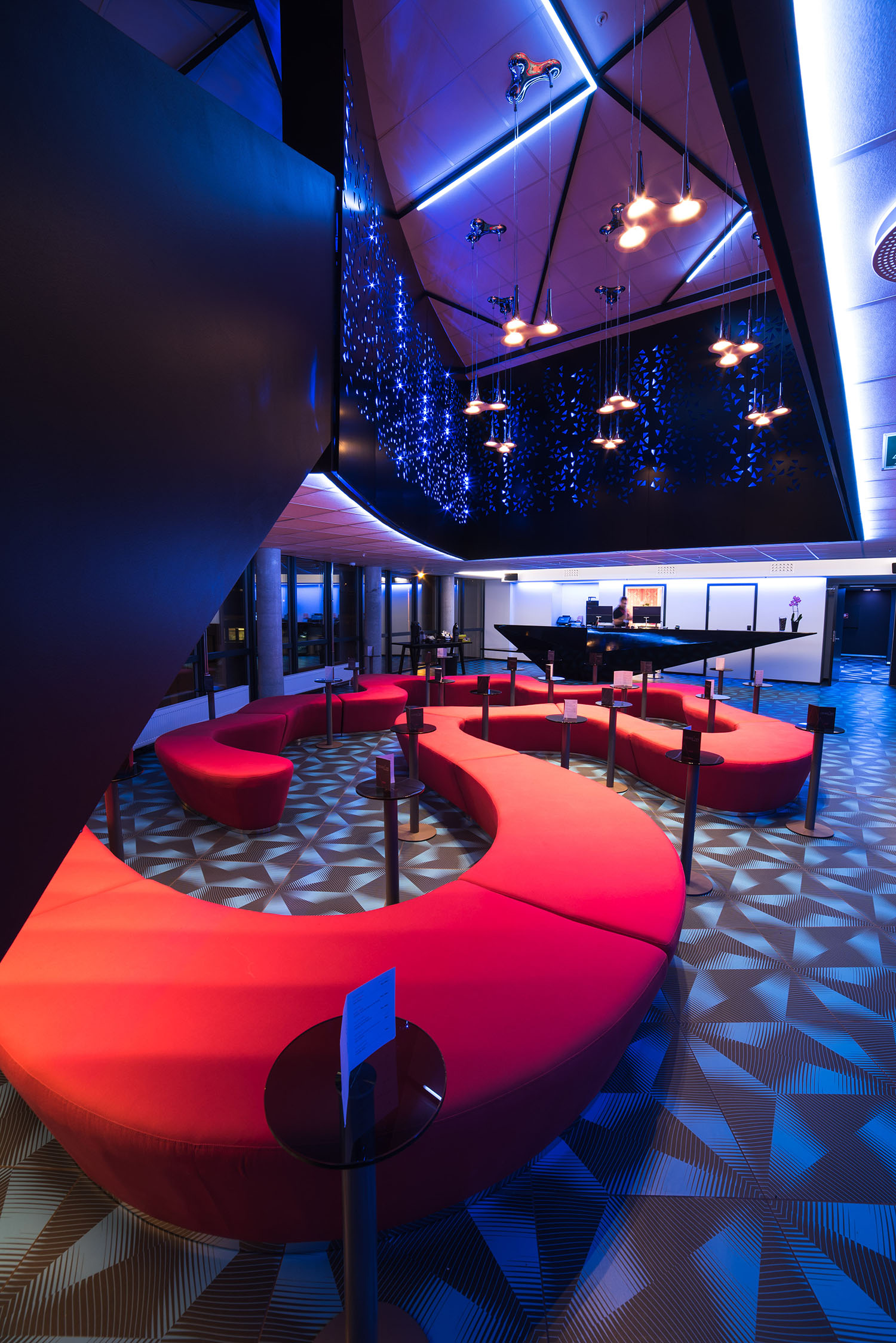 Axo Light took part in this project by furnishing the hall of the Magic Hotel with Nafir suspension lamps designed by Karim Rashid himself.