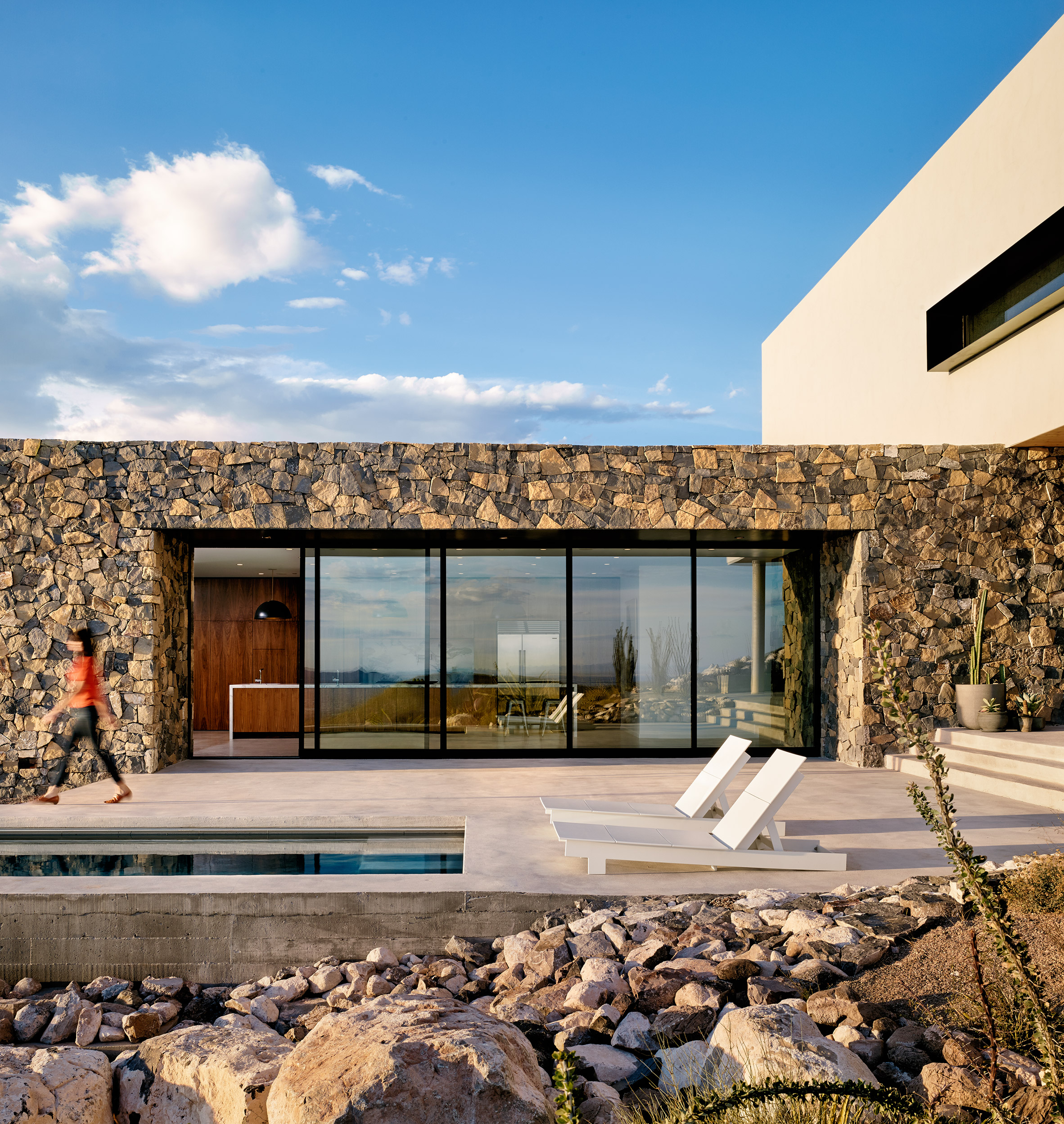 In contrast, the top volume is faced with white lime stucco and was placed at a perpendicular angle. The volume is punctuated with elongated windows framed in black.