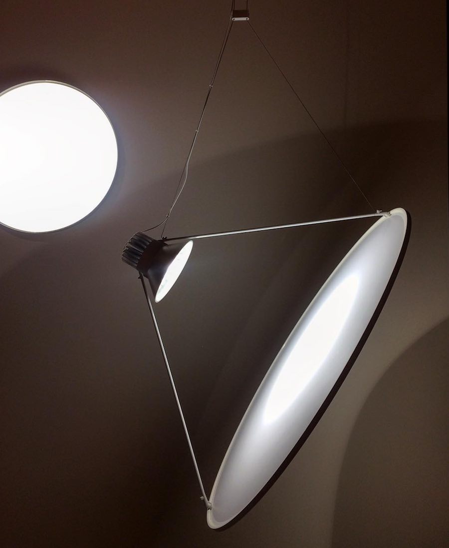 Luceplan presents Sol_03, a ‘solar sail’ lighting design by Norwegian talent Daniel Rybakken. A powerful light source projects a beam of light on a large and lightweight disk made of a white translucent film or a metallic mirrored membrane stretched inside an aluminum circular profile. “Thin poles connect the two main elements. By changing the length and the connection points of the two supporting wires, the rotation of the disc can be adjusted at any angle” says the designer.