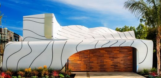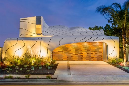 The home’s aluminum skin is skillfully orchestrated, emulating the beauty of nature’s own eloquent geometry. Appearing as if one massive undulating facade, the painted aluminum flows from over two stories high until finally arriving to touch the ground in one single flow. “I wanted to unite the sky and the earth in a single move, an architectural element that no one has ever achieved.”