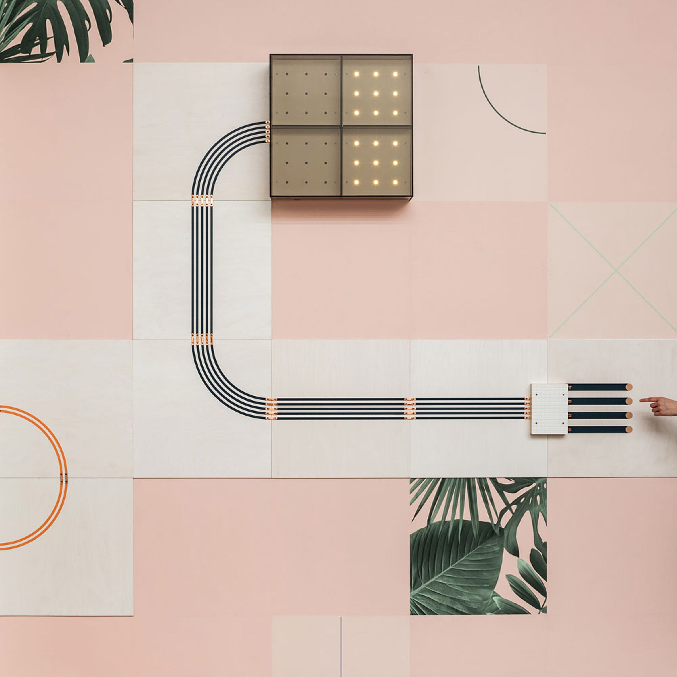 The designers intended the display to create a unified system between the wallpaper tiles and the speakers, lighting and moving objects, setting it apart from other projects using conductive ink. "What interests us in the collaboration is of course using simple technology, connective ink, but the opportunity to bring together 2D design and 3D design together into some kind of an immersive experience," said UM Project founder François Chambard.