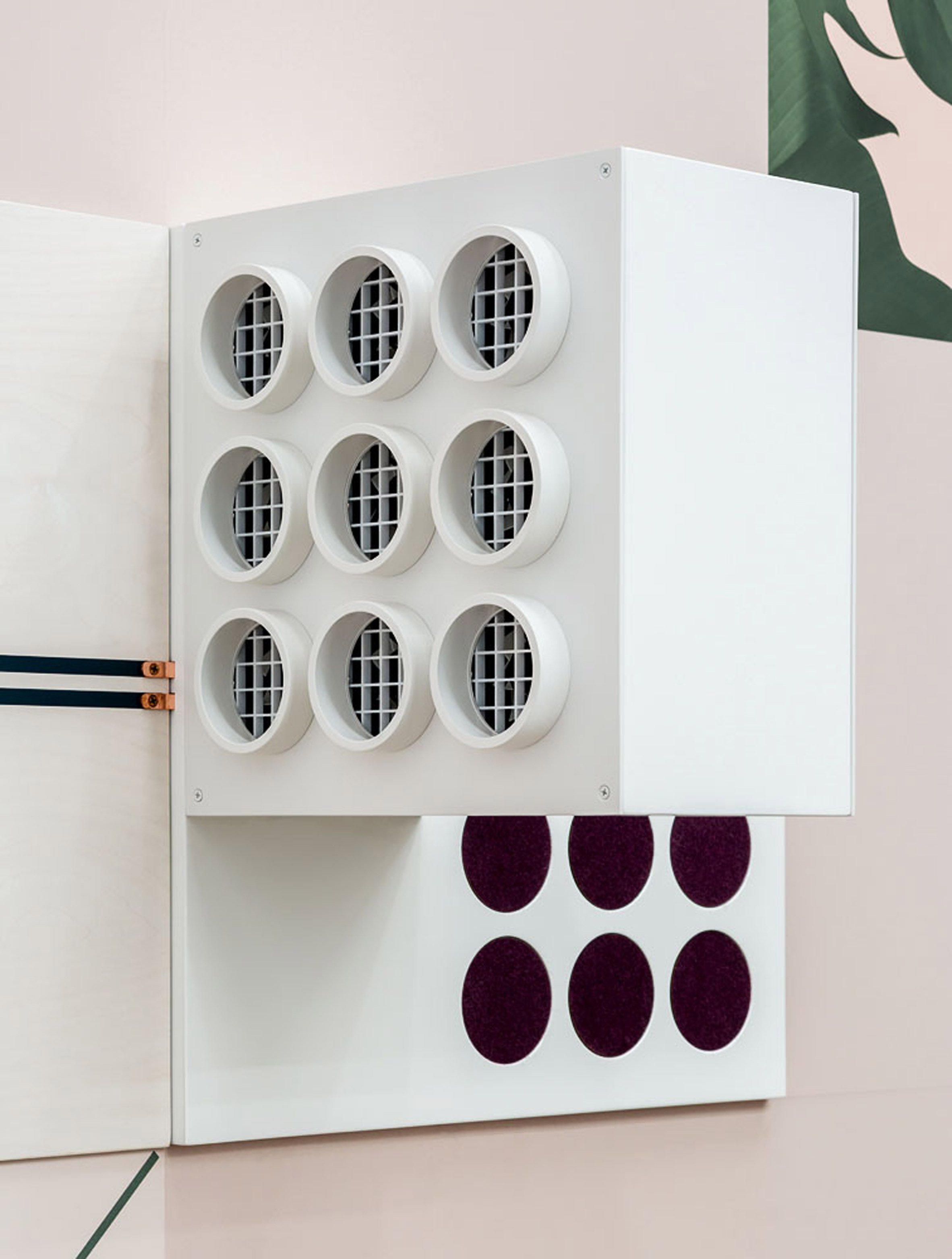 img.0 Lines of conductive ink thread between the protruding speakers and light boxes that form this interactive wall display, designed by UM Project and Flavor Paper.