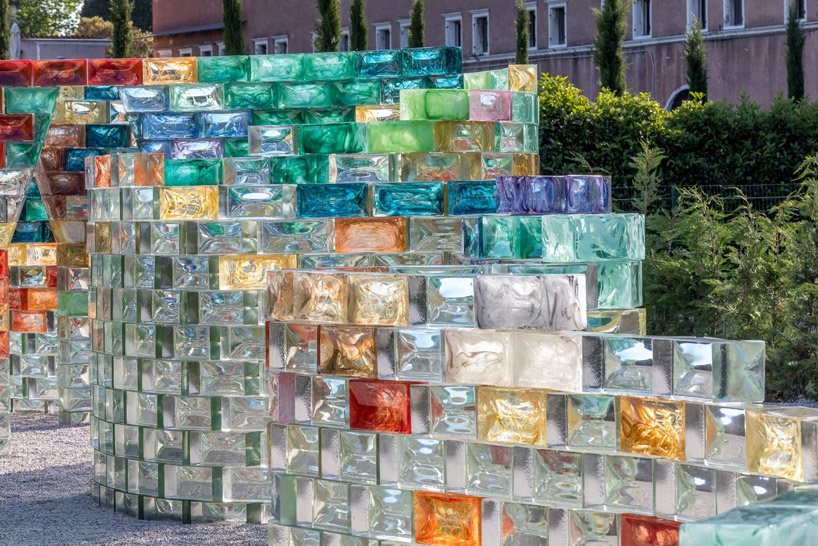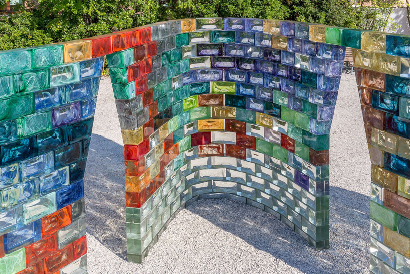 Coinciding with the Venice Biennale, American artist Pae White has created a curving wall made of colored glass which forms an abstract impression on the landscape. Located on the island of San Giorgio Maggiore, the architectural sculpture titled ‘Qwalala’ - commissioned by Le Stanze del Vetro - uses thousands of ‘bars’ handmade in Veneto.