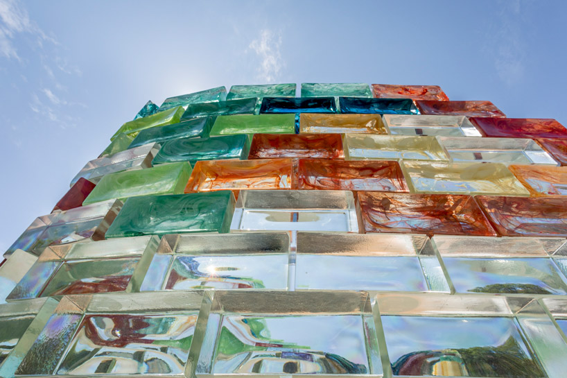 ‘Qwalala’ is a term invented by the Pomo tribe of native Americans which makes reference to the course of the Gualala river in northern California both in structure and layout. The color scheme and construction was chosen by Pae White in collaboration with Le Stanze del Vetro from thousands of random computer-generated combinations, using a software specifically designed for the project. From above the sculpture creates a snake-like imprint upon the environment. On closer inspection, entranceways are inserted within the design, allowing visitors to walk in and around the piece. These two perspectives change and distort depending on the viewpoint of the viewer which, combined with the position of the sun, establishes an evolving sculpture upon the island.