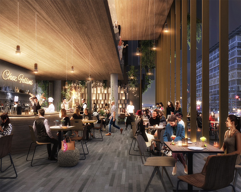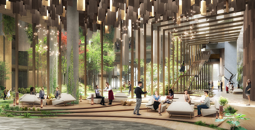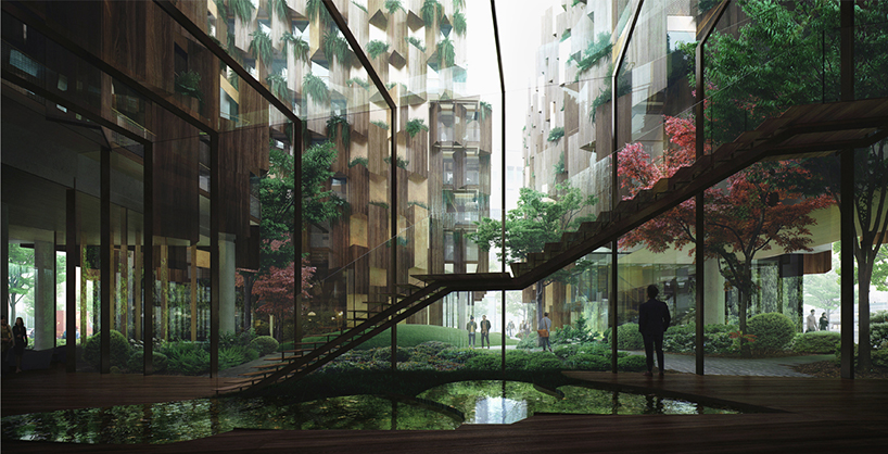 Inside, landscaping continues to play an important role throughout Kengo Kuma‘s hotel proposal. The ground floor will be open to promote visual transparency and used for commercial and retail opportunities. A sport facility and business center (1Hotel), youth hostel (slo living), performance bar and restaurant, co-working space will offer guests and visitors a range of facilities.