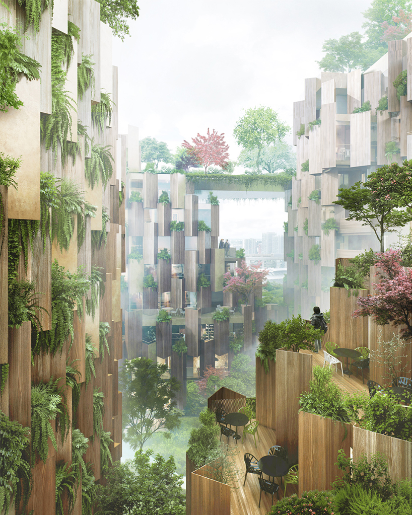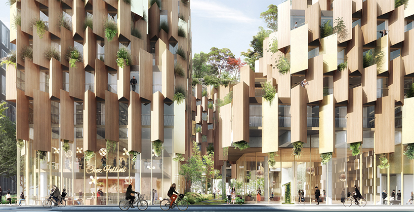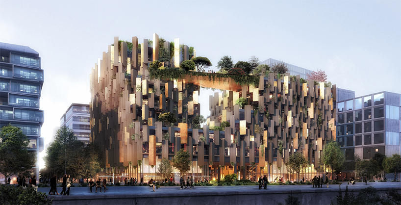 The building itself will be overflowing with greenery, becoming a ‘green lung’ for the neighborhood. Wooden façade panels will be overlapped and arranged in an inconsistent manner to blur the shape of the structure. Meanwhile, the warm materiality of the wood will be integrated with metal panels to produce a soft, reflective effect.
