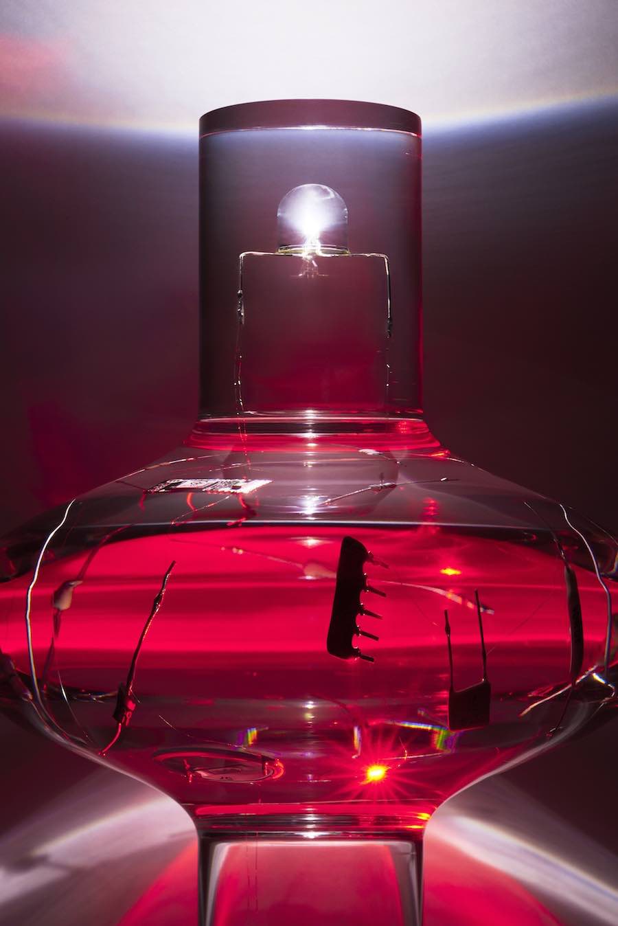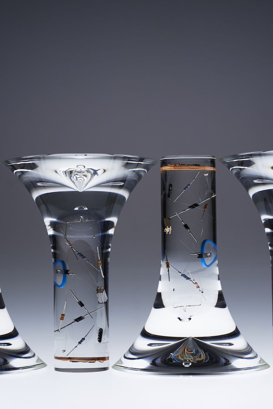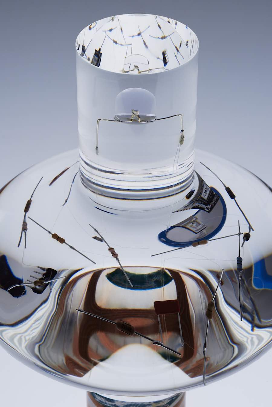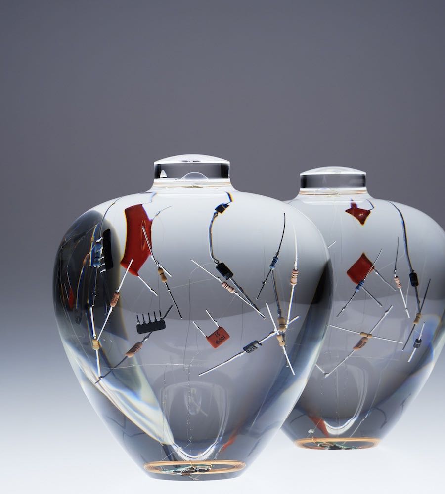 Resin is generally used to create external shells protecting the hidden electronic part. The Composition collection breaks this rule by meshing it with chips and wires to create “a pure object that seems to rise up out of the materials”.