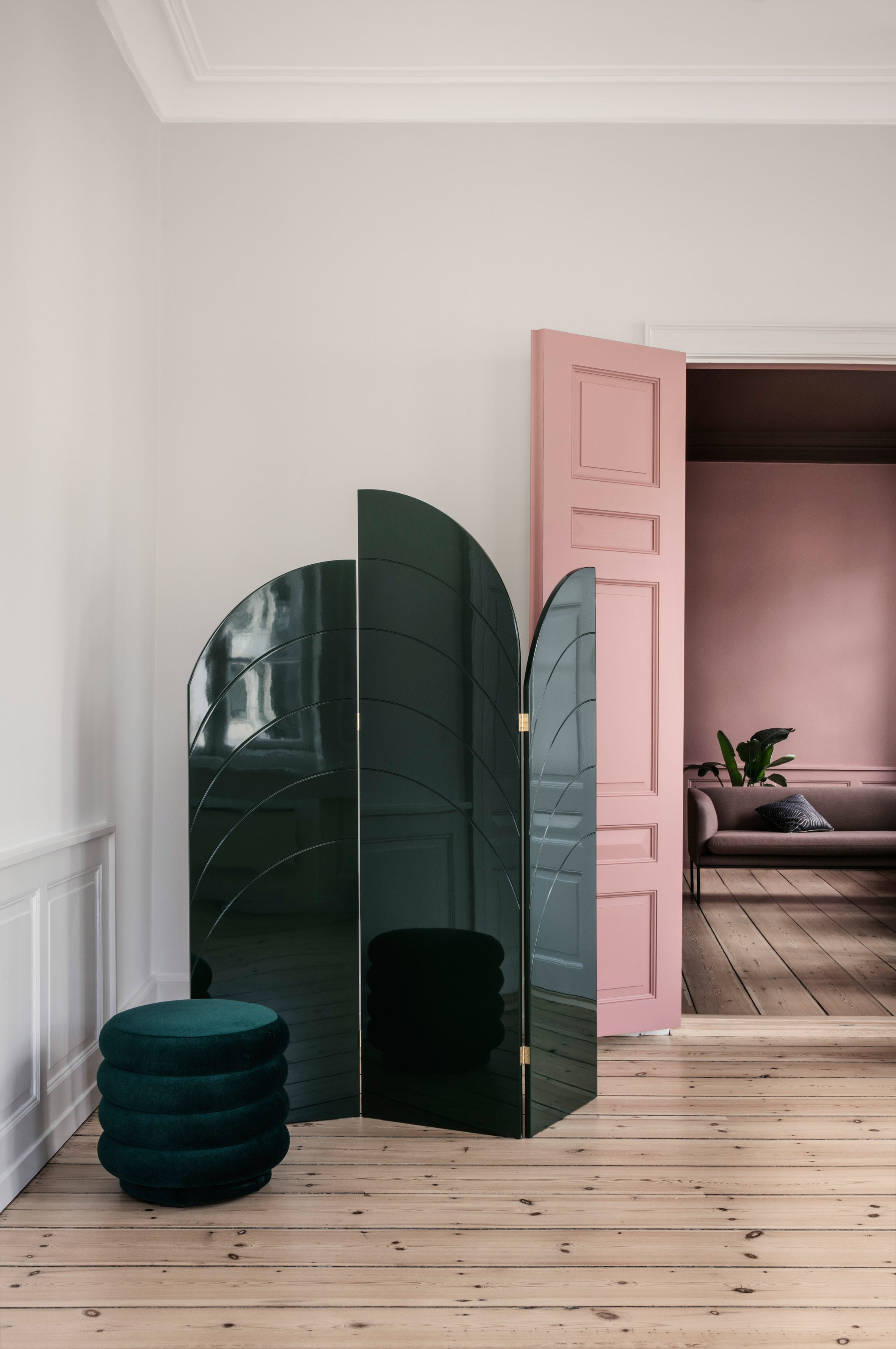 The Unfold Room Divider features three arching glossy lacquered panels with curved milled grooves that are finished in either pale pink or forest green – a colour combination that features throughout the entire collection.