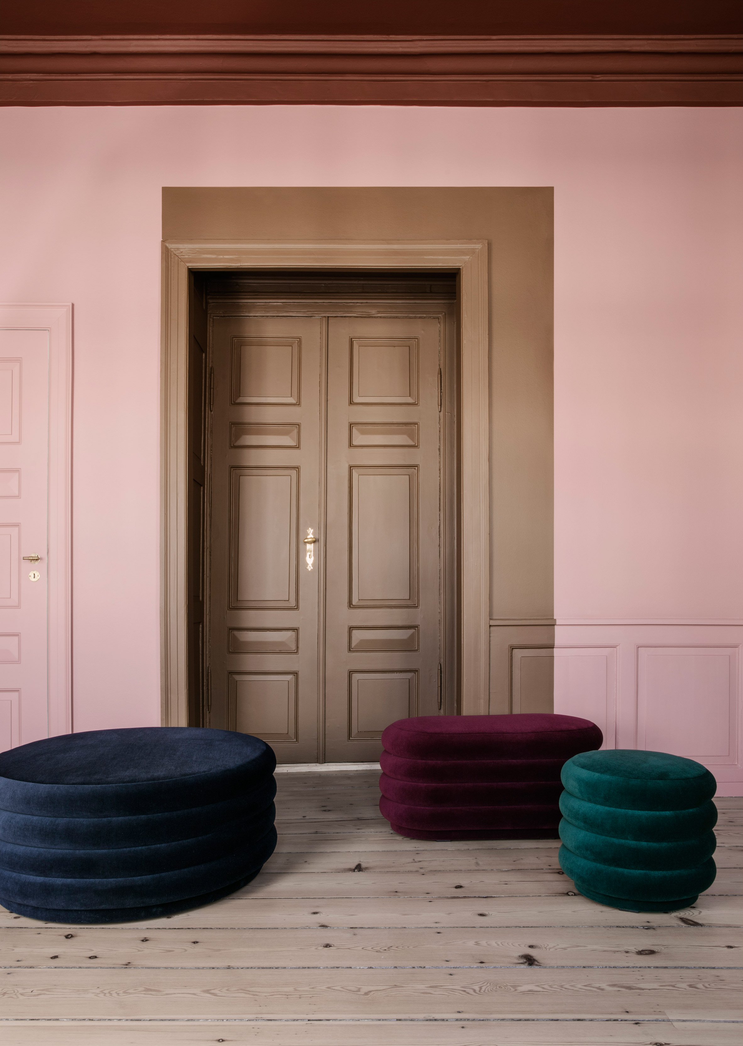 Claiming to blend "the essence of a graphic Nordic design identity with an allure of understated sophistication", the new pieces include a room divider that evokes the art deco period, a series of jewel-toned velour pouffes and a collection of unglazed stoneware pieces.