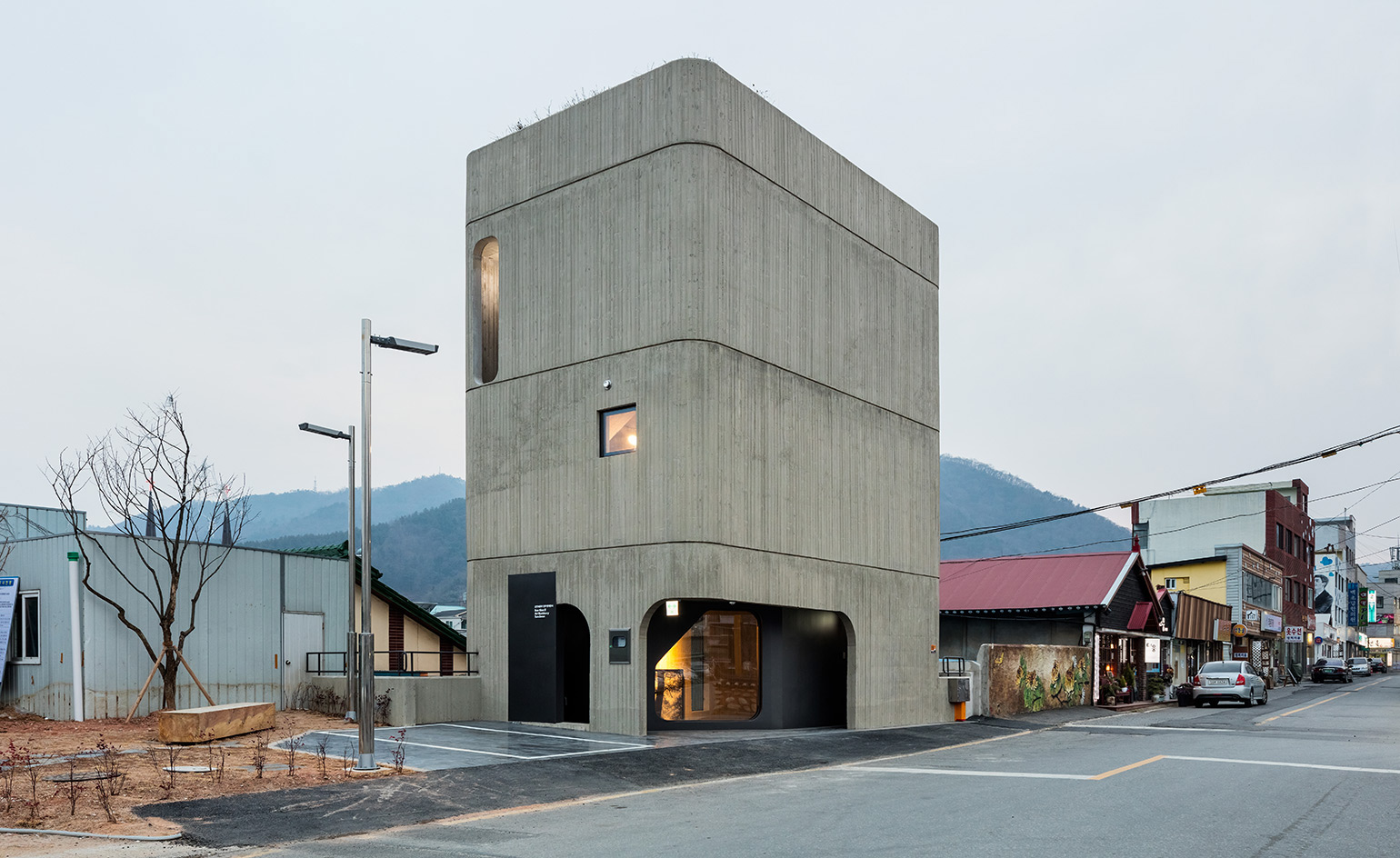 Chanjoong Kim, of architecture studio The System Lab, has spent his career eking out space from unlikely sites, and this four-storey concrete tower, a new studio, house and gallery for photographer Bae Bien-u, stands in stark contrast to its low-rise neighbors. located in southern Korea, the building is effectively a double-skinned concrete tube. the sober materials palette references Bae’s monochromatic depictions of landscape and forests, creating a stacked brutalist landscape. the staircase is sandwiched between the walls, allowing the circulation space to loop upwards from the basement exhibition space to the private rooms and rooftop garden.