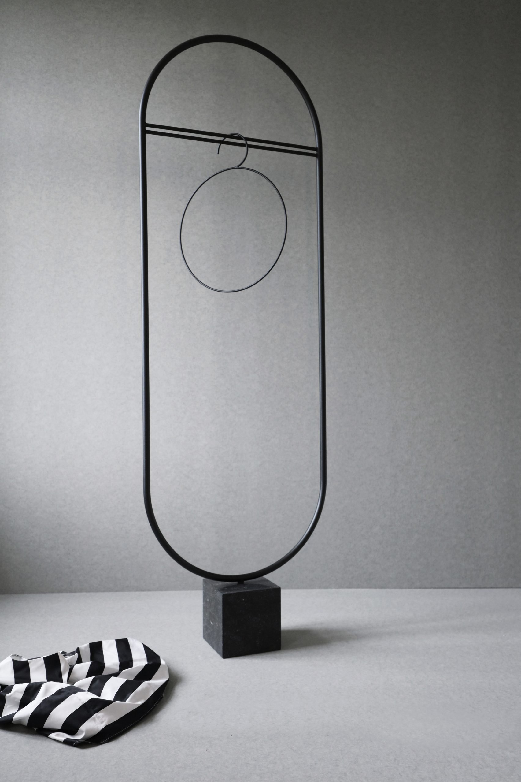 This minimalist coat stand was designed by Ida Linea Hildebrand, creative director at Danish brand Friends & Founders, in collaboration with designer Katrine Bjørn. It features a slim black frame anchored by a marble block, and comes with a set of hangers in different geometric shapes.