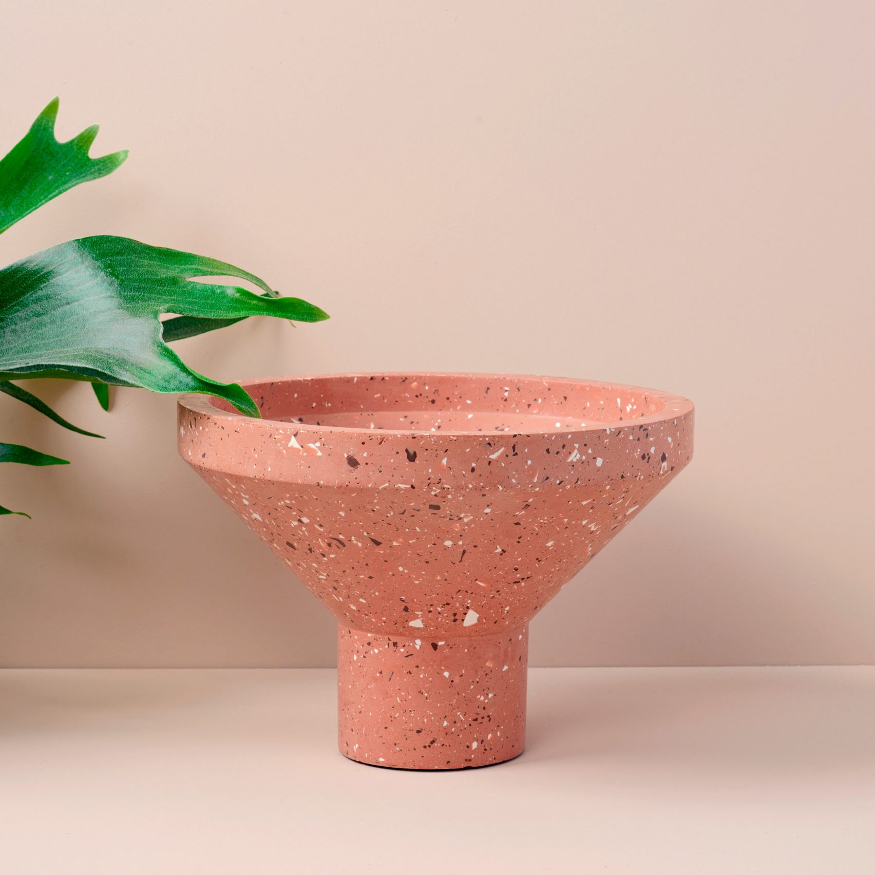 Two materials of the moment – Jesmonite and terrazzo – have been combined by Olivia Aspinall Studio and Ornamental Grace for this range of colourful vessels. The patterned surface of each limited-edition piece is created by pigmenting Jesmonite aggregate pieces, and adding them to a main base mix.
