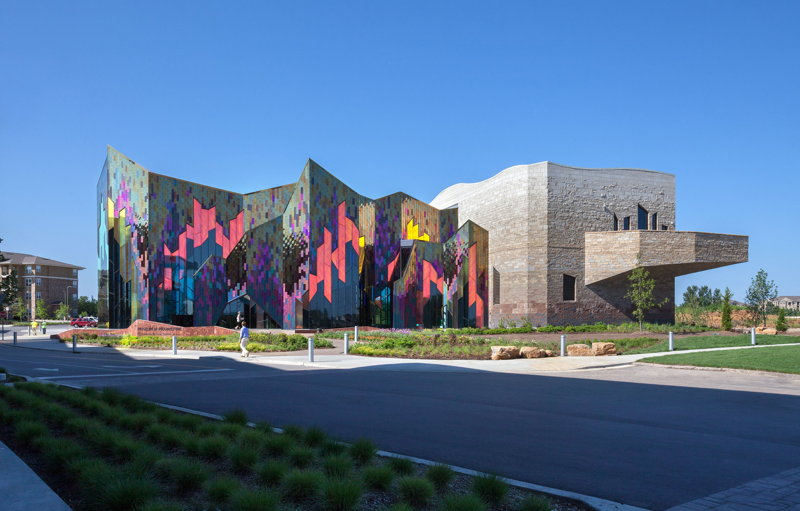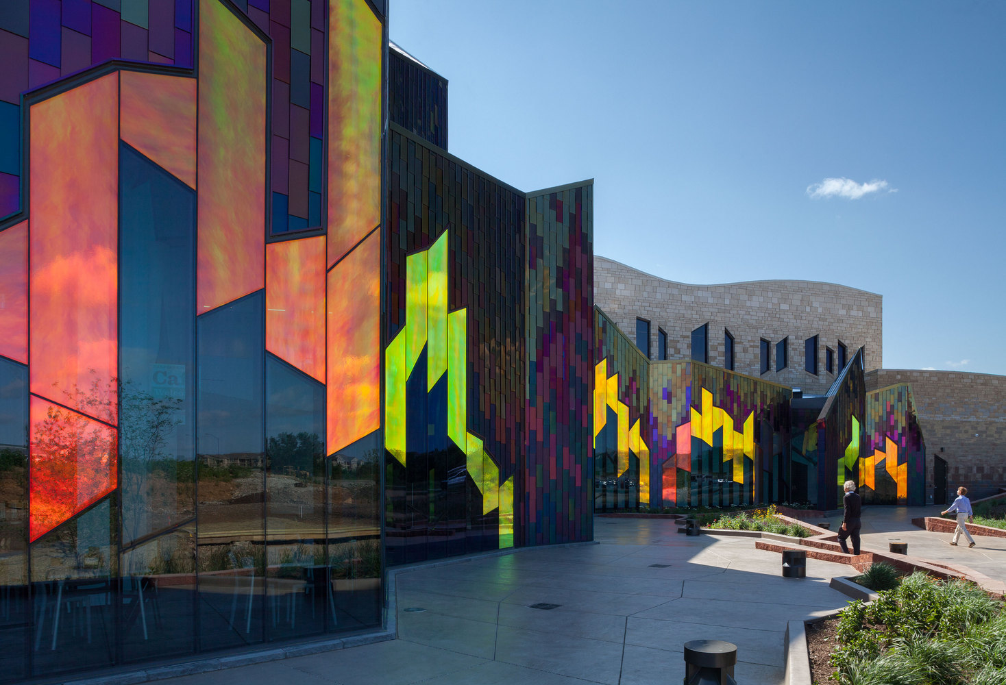The architecture of the Museum at Prairiefire in Overland Park, Kansas, celebrates the rich story of the region, stemming from the Kansas tradition of controlled prairie burns. Real Estate developer, Merrill Companies, contacted prominent Museum and Architect Planners – Verner Johnson to aid in creating a structure that would match the surrounding landscape. Jonathan Kharfen, the lead architect on the project examined the landscape and its characteristics and developed an idea to create a building that looked like flames ablaze in the fields. The design evoked a sense of irony, according to Jonathan, “it’s not traditionally a building’s job to conjure up images of fire, in fact, it’s quite the opposite”. The obstacle presented here was how to capture the upward and expansive movement of fire, adding animation to a building constructed of lifeless materials. The solution was to use a combination of multi-colored, iridescent stainless steel tiles, mixed with an innovative use of Dichroic Glass. These products, in conjunction with the stone volumes as a backdrop, provided durability and design versatility, resulting in vivid, inextinguishable color.