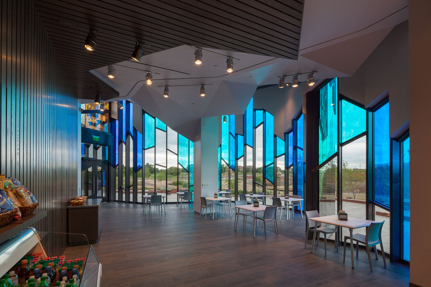To truly capture the fire element, Light Interference Color stainless steel panels – from Millennium Tiles, were used to complement the dichroic glass. The light and color changing properties of these two materials emulate the unique characteristics of fire. As the light conditions change throughout the day, the colors of the building move and dance the way flames flicker.