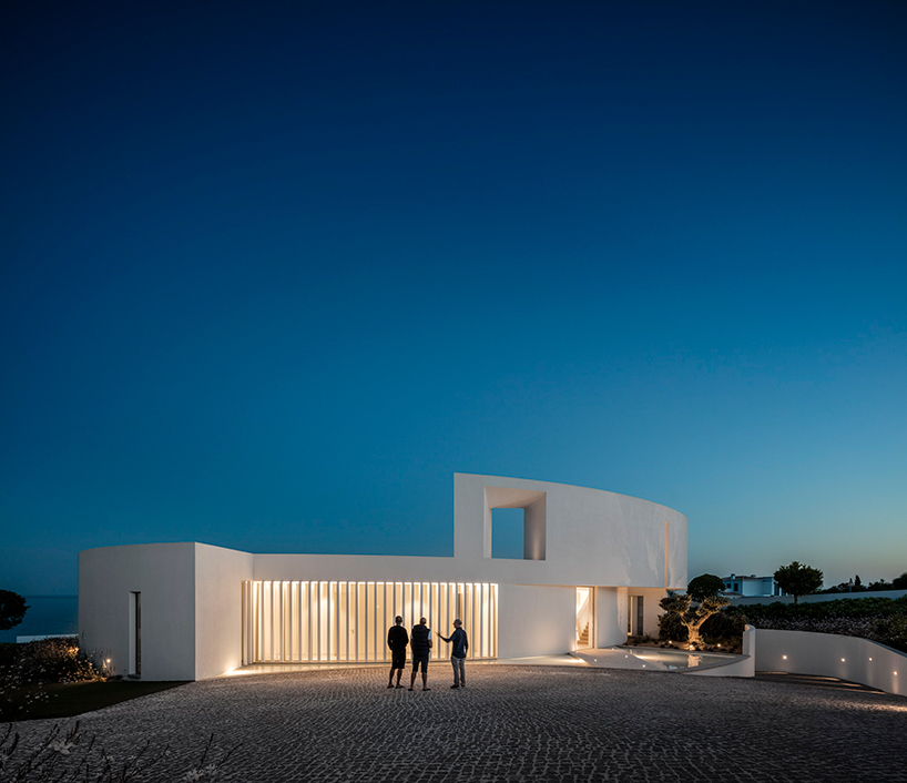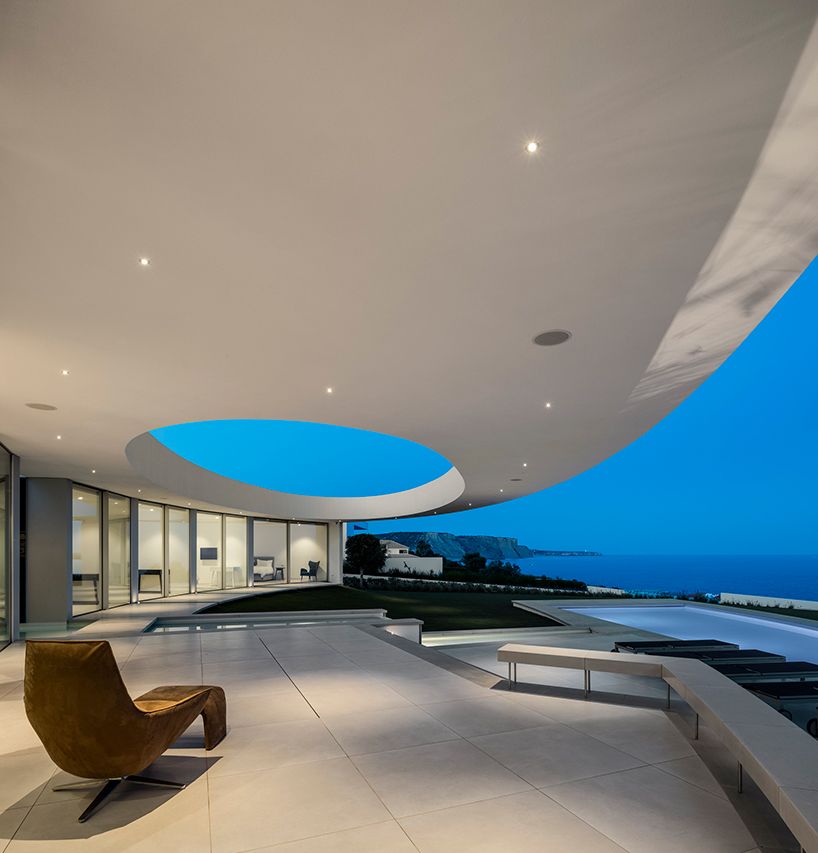 The unified interior and exterior spaces are both an intense white, a characteristic of many homes that extend along the seaside slope. Mário Martins Atelier has sought to create a connection with the existing, neighboring house to the east, relating back to the concept of ‘balance’ which lies at the foundation of the design. This sense of equilibrium can be found throughout the structure. The density of the elliptical base contrasts greatly against the oculus that floats above the outdoor patio area — creating a dynamic relationship between both positive and negative spaces, density and airiness, and light and shade.