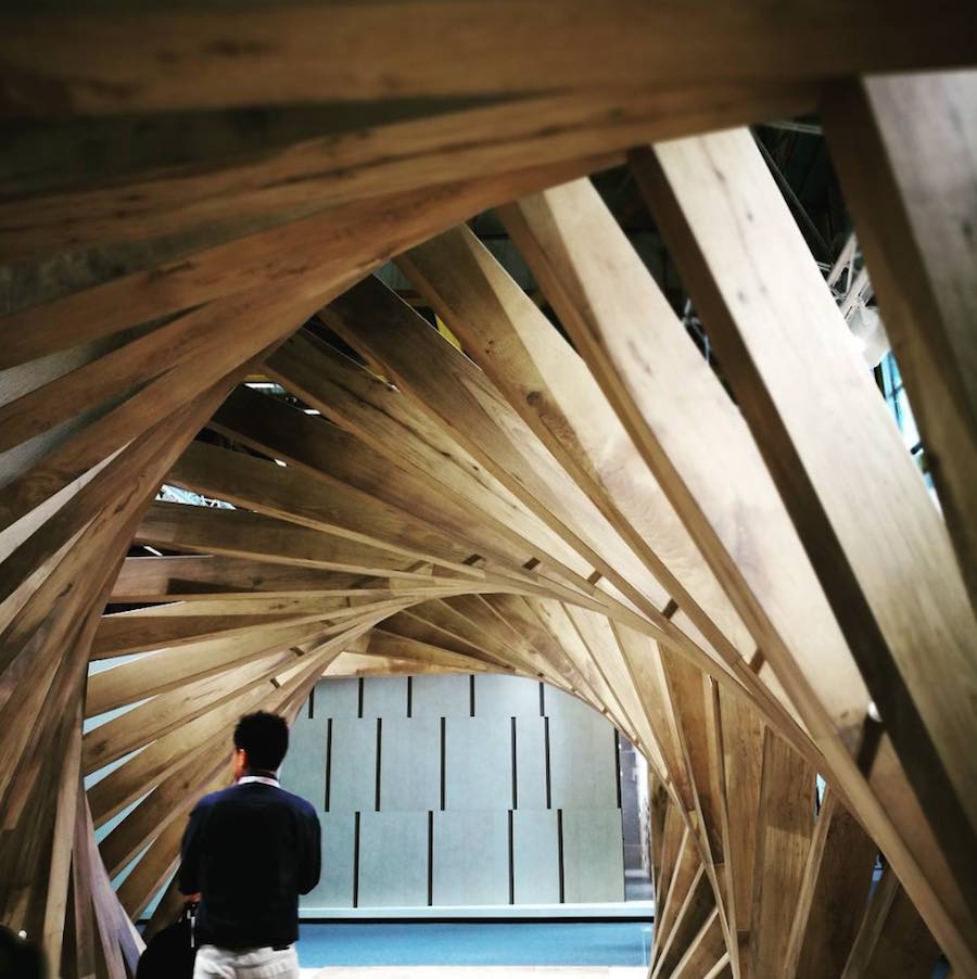 Emil Ceramica presents its new collections with instagram-friendly installations like a “twisting road” made of wood-inspired slabs of the 20Twenty series and a vertical kaleidoscope-tunnel projecting black and white tiles infinitely.