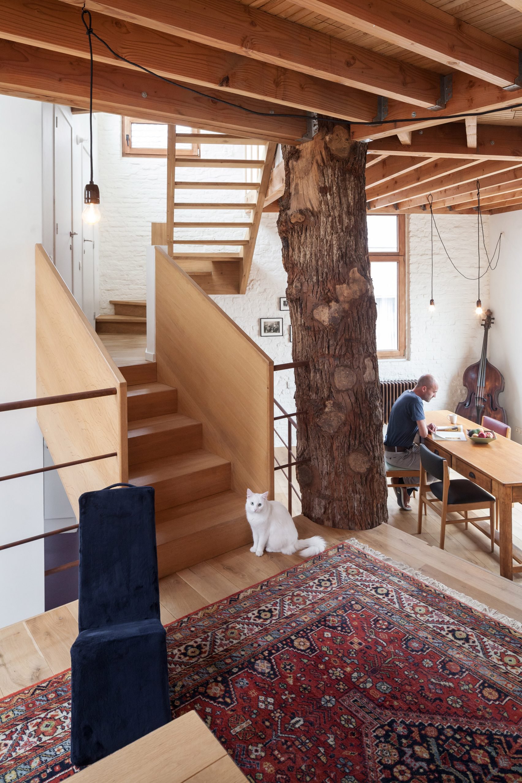 Using a 12-metre-tall oak tree as a central structural column, the architects built a series of mezzanine floors that spiral around the trunk to form a pentagonal plan. "It was a Gordon Matta-Clark-like intervention," the architects said, referring to the American artist known for his dramatic architectural interventions.