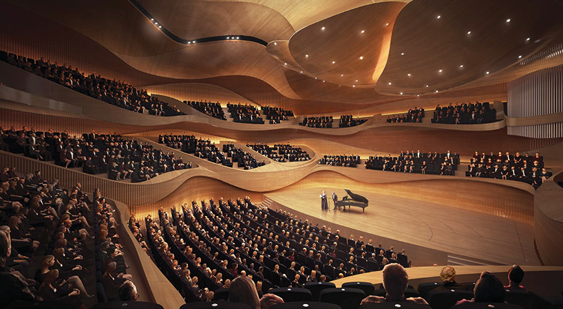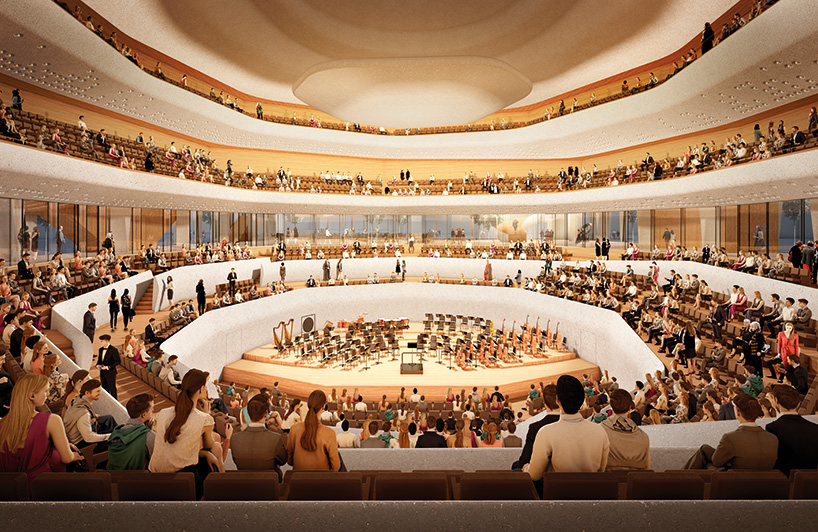 The entry by PFP Planungs, which came in as runner-up, features a façade punctured with small spherical openings. The sculptural shape of the structure has been designed in response to its neighboring buildings, while the main entrance is accentuated and defined by a bold incision in its mass. David Chipperfield’s third placed proposal appears externally as a ziggurat, while internally the smaller hall is found at the top with the main one below. iI the larger auditorium the audience is seated on a continuous ramp, which recalls the form of the staircase that wraps around the building itself.