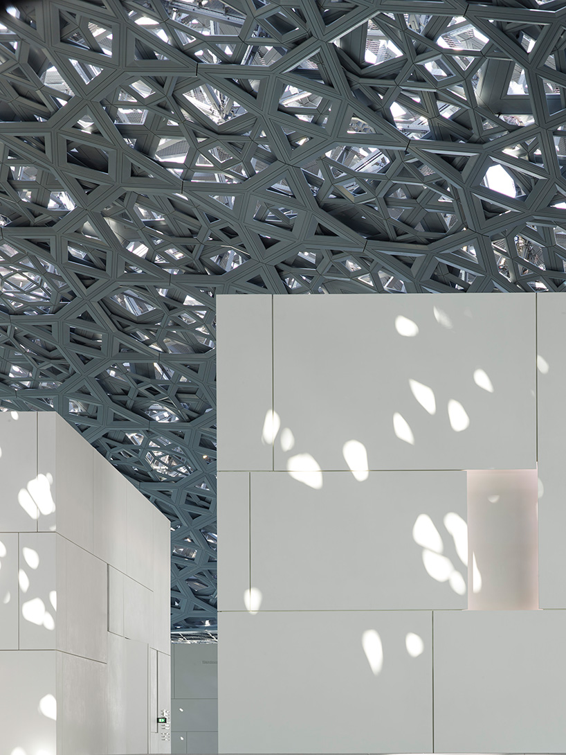 Referencing traditional Emirati architecture, Louvre Abu Dhabi appears as a series of 55 white structures that mimic the low-lying settlements common to the region. The centerpiece of Jean Nouvel’s ambitious scheme is a huge dome — 180 meters in diameter — that appears to float above the entire museum. This complex geometric structure comprises 7,850 ‘stars’, repeated at various sizes and angles in eight different layers. As the hot sun passes above, light filters through the perforations to create an effect referred to as the ‘rain of light’.