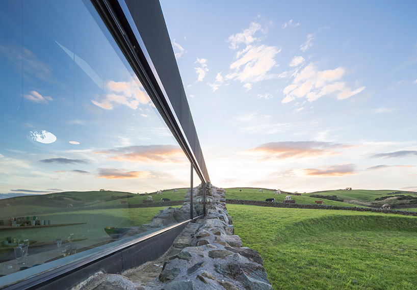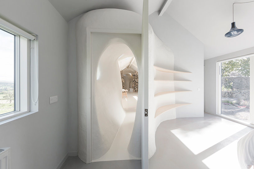 As the original farmhouse had been modified on a number of occasions since its construction, Lily Jencks Studio and Nathanael Dorent Architecture carefully selected a sequence of materials and geometries that would highlight its storied history. ‘The first layer is the existing stone wall, within which sits a black waterproofing EPDM rubber clad pitched-roof ‘envelope’, and within that a curvilinear interior ‘tube’ wall system,’ says the design team. ‘This interior curved surface is made of insulating polystyrene blocks within a gridded wood structure, and is covered with glass reinforced plastic.’