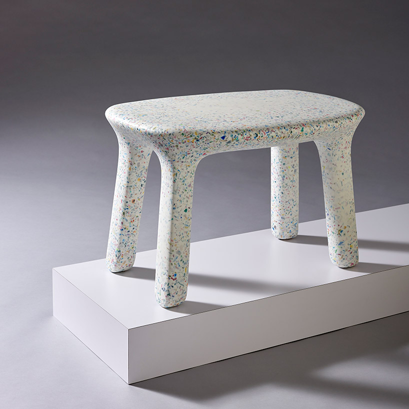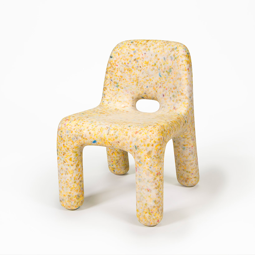 Following an in-depth two-year study period exploring how to sustainably recycle plastic toys, ecoBirdy creates pieces that are 100% made of recycled plastic waste. The process starts by collecting, sorting, cleaning and grinding old and unused toys. Once separated into colors, the flakes are transformed into a single item with a speckled look. Rounded edges and a smooth silky surface result in furniture pieces that are pleasant to touch and easy to clean.
