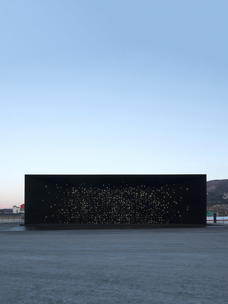 Visitors will encounter the building when entering the Olympic Park in South Korea. The pavilion is commissioned by Hyundai Motor as part of a series of projects on enhancing people’s lives by making mobility easier. Another project in this series is the world’s first Hydrogen Fuel Cell vehicle. The Olympic building is derived from Hyundai’s vision of a sustainable future: the black facade represents the Universe and the interactive water droplets were inspired by individual Hydrogen molecules and the technology behind Hyundai’s new Hydrogen vehicle.