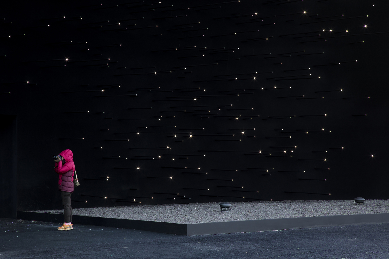 The Olympic pavilion is entirely coated with Vantablack VBx2 and illuminated by thousands of tiny white light rods. These rods extend from the structure's parabolic super-black facade and create the illusion of a field of stars suspended in space. Looking at the building will be the closest experience to looking into space from a point on Earth.
