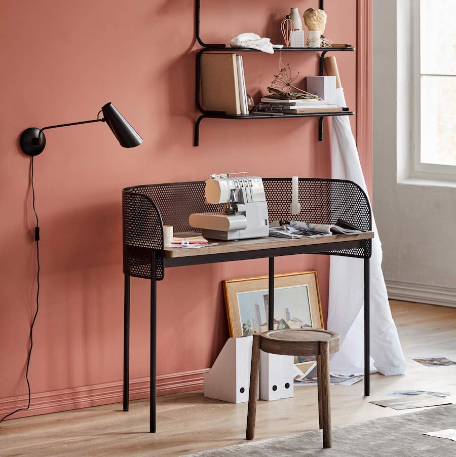 “Just as a shelter in a storm creates a safe haven, this combination desk and console provides a stronghold for essentials and artefacts”. Spanish design duo Yonoh designed SHELTER, a tabletop crafted from smoked oak and perforated steel forming a lightweight screen that wraps around the front and sides.