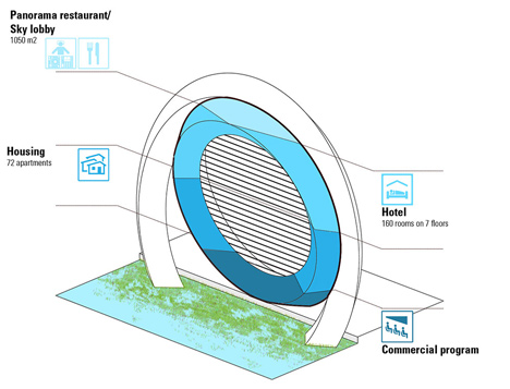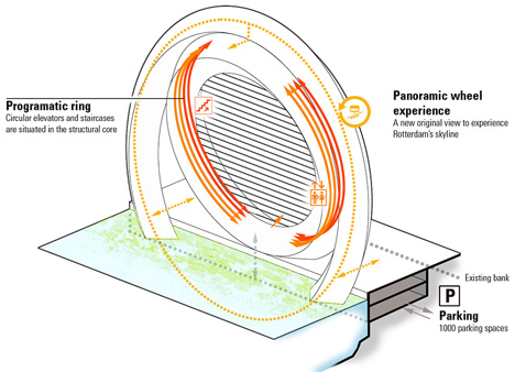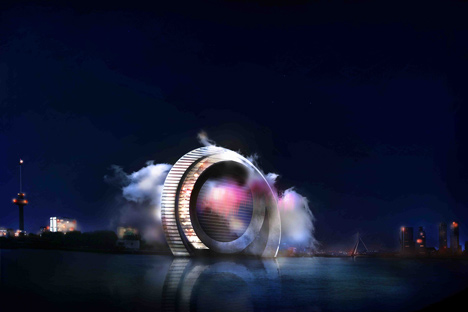 Billed as "the most innovative windmill in the world", the Dutch Windwheel is intended as a landmark attraction for Rotterdam's waterside. Architecture studio DoepelStrijkers designed the structure and is promoting it with the help of partners Meyster's and BLOC. The designers imagine the 174-metre-high structure as being framed by two rings – a rotating outer ring made up of 40 rollercoaster cabins, and a static inner ring containing flats, a hotel and a restaurant.