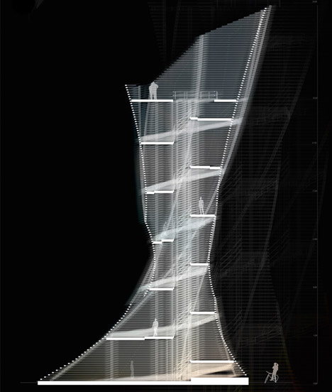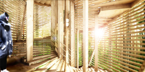 The proposed location is a forest nearby, and the architects want to build 90 per cent of the tower's structure from wood to evoke its natural context. The structure's spiralling form is intended to look like a tree that spreads out at its base and canopy – the result of a hexagonal section that rotates gradually as the tower ascends.