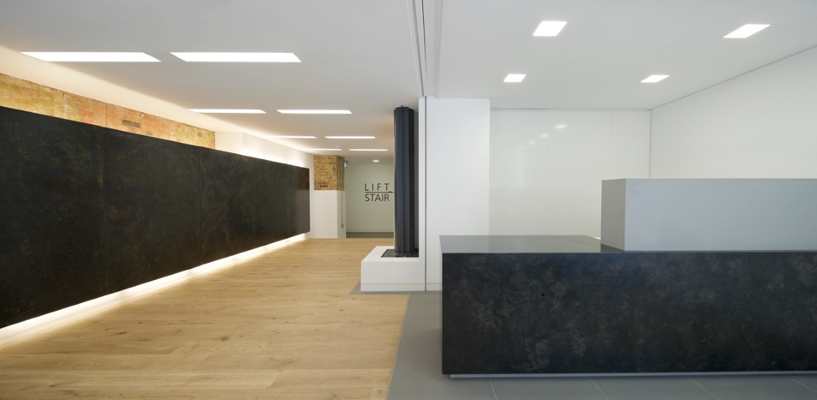 The image of this entrance to a business complex in London reflects the materic palette of lofts (white walls, wooden plank flooring, cast iron columns, natural materials) and, at the same time, the figurative dimension of the finest expressions of Arte Povera, in the metal wall installation made by Marzorati Ronchetti with large sheets of etched carbon steel.