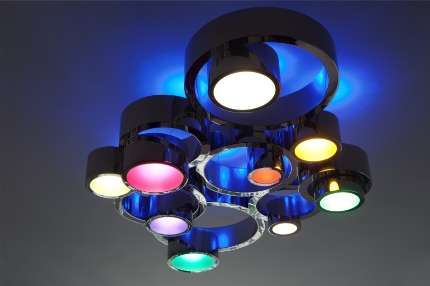 In the living room the second chandelier, “Circle Game,” plays the role of a central steel sculpture based on the interlocking of circumferences and cylinders to create a complex figure with rings at different heights. The light sources are fitted with coloured opal glass, adding a rich chromatic range to the monomateric steel solution. Finally, a series of blue Leds colour the ceiling, creating an effective play of reflections on the mirror surfaces.