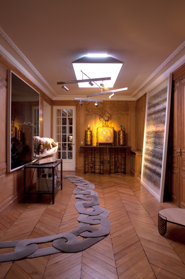 In the entrance of the house the first chandelier, “Slash,” is like an abstract installation composed of an initial rectangular part in black painted sheet metal with Barrisol sheet used to uniformly spread the variable-tone Led light. The light emerges like an upper halo, colouring part of the ceiling, to indicate the intentional separation between the lamp and the domestic surface. This first light element is joined, in the lower part, by a system of suspended tracks in mirror-finish stainless steel, on which to attach cylindrical spotlights.