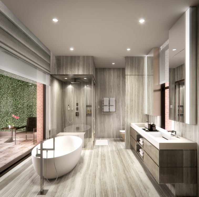 Ranging in size from 2,044 to 4,263 square feet, each residence has a graceful, flowing layout filled with luxurious finishes in a refined neutral palette and coveted outdoor space. These true three-bedroom residences, each receiving abundant natural light, are a rarity in SoHo. Kitchens feature custom lacquer and glass cabinetry, Fior Di Bosco marble countertops and backsplashes, with Miele and Sub-Zero appliances. The large master baths have stunning marble slab walls and floors, an oversized soaking tub, custom vanities, and fixtures from Dornbracht and Duravit.