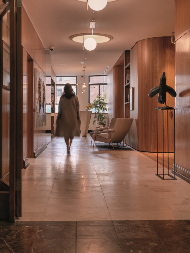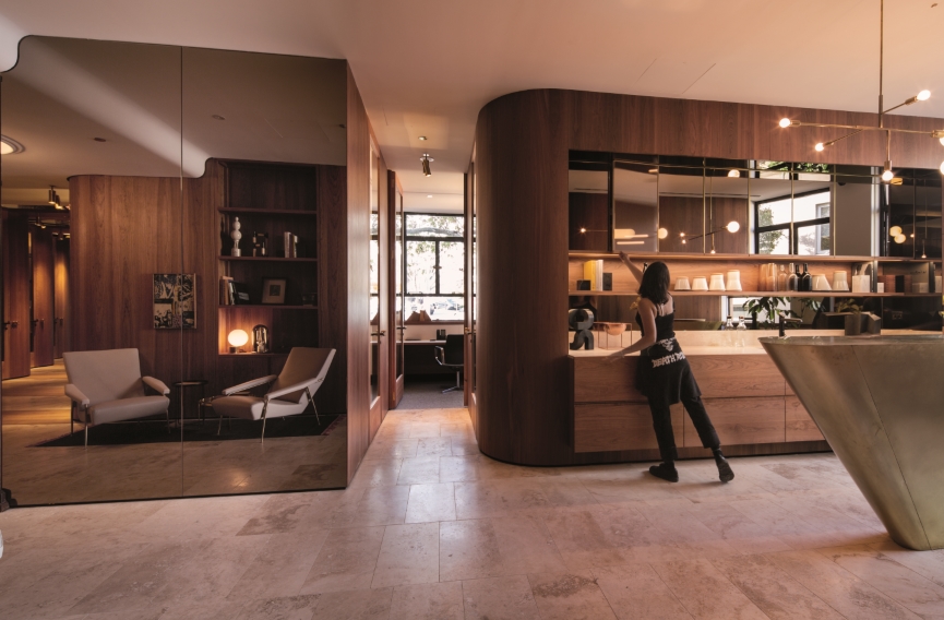 Located within the iconic Paramount House in the heart of Sydney’s Surry Hills, Woods Bagot and Elan Construct have created a co-working experience that seamlessly combines function, aesthetics and luxury. Paramount by The Office Space comprises 22 private office suites, a meeting and boardroom, kitchen area and a stunning purpose built brass bar. Mid-century design pieces from Walter Knoll and Molteni&C and custom furniture unite with the technological requirements of contemporary business. The outcome is a sense of luxury, comfort and sophisticated hospitality within a modern office setting.