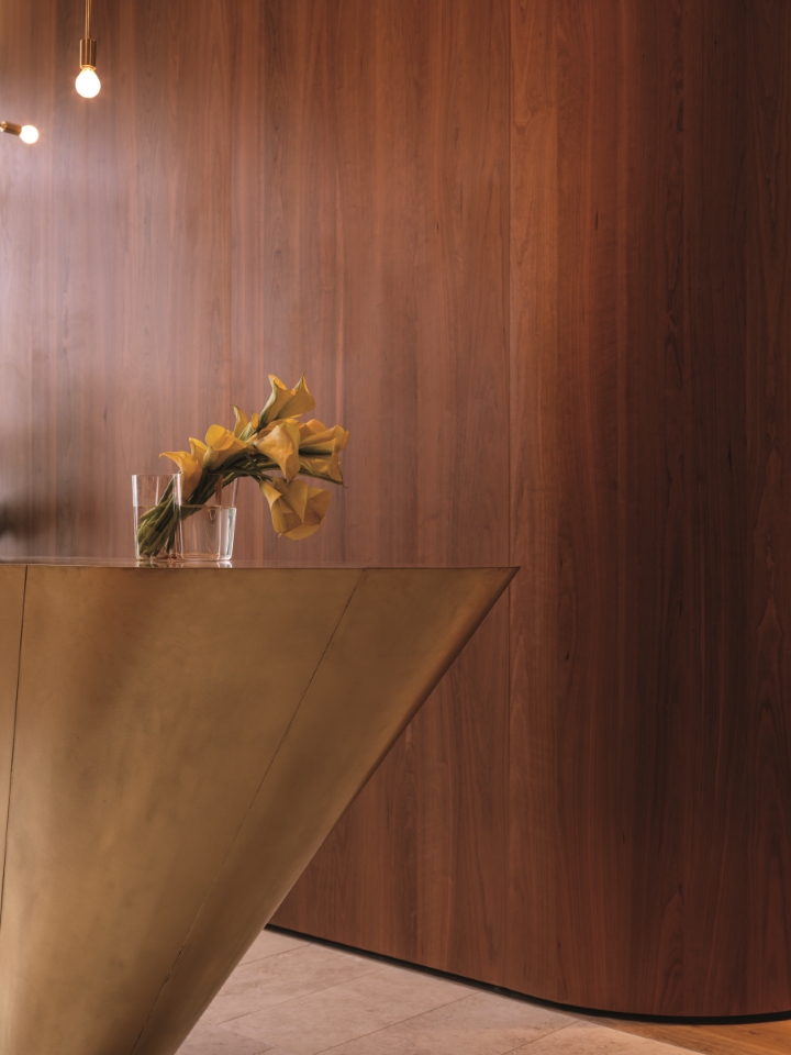 Natural materials including limestone, leather and marble combine with burnished brass fixtures to contribute to the high-end glamour which emanates from the extensive use of American black cherry solids and veneers throughout the space.