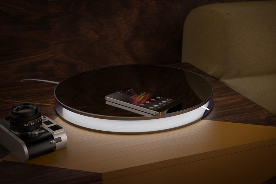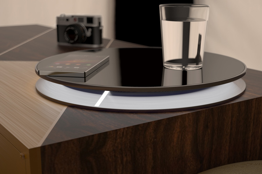 Materials: dark brushed steel, polycarbonate, polished polymer for inductive charging, electrical equipment, dimmable LED strip, scratch-proof film; sizes 30Lx30Wx 5H (cm).