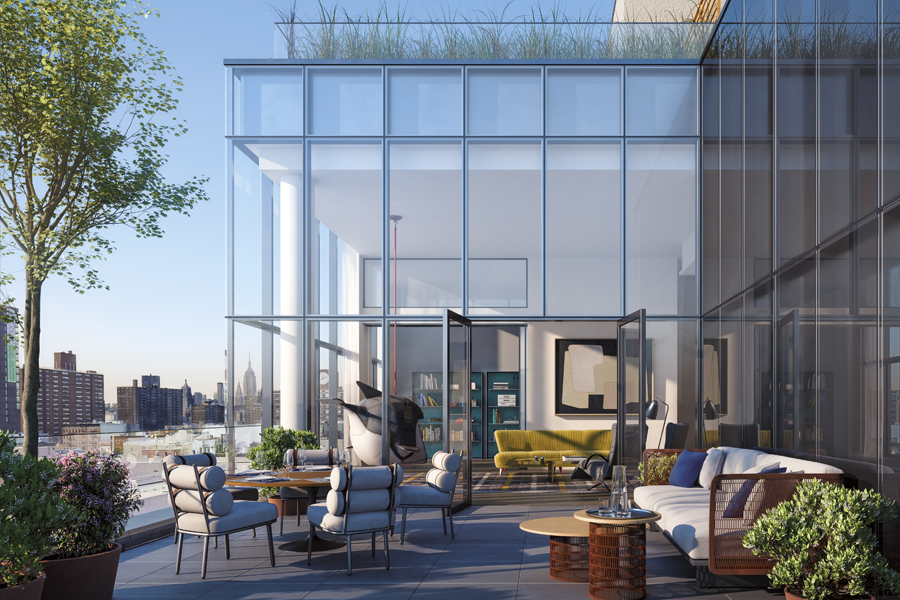 Featuring soaring ceilings of 12’9’’, the penthouse residences offer custom kitchens, Italian, custom-made translucent sliding-glass doors by Rimadesio, and smart home technology that allows for temperature, lighting, and audio control through a single device. Dual outdoor spaces in each apartment include a private terrace directly off the living room, and a private rooftop with gas grill – both of which offer amazing views of New York City.