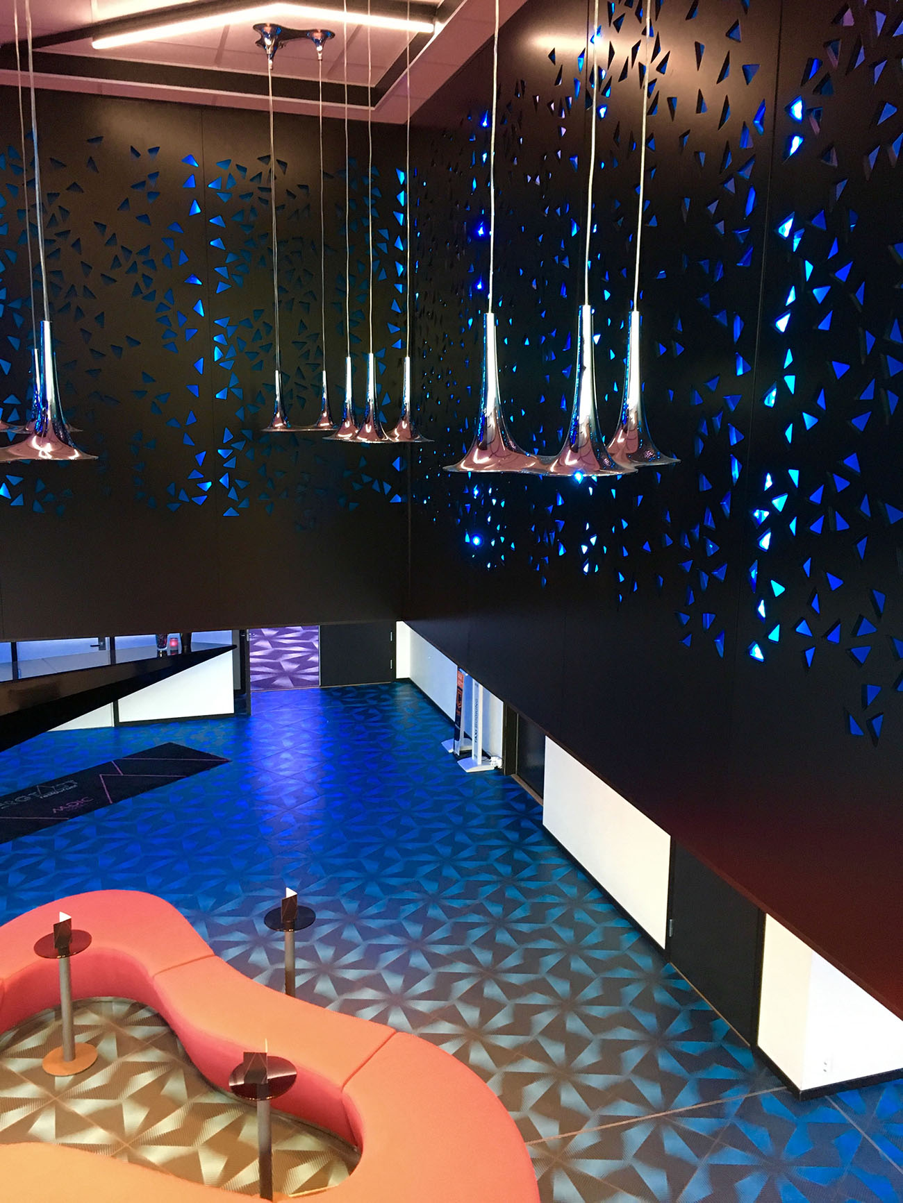 Axo Light took part in this project by furnishing the hall of the Magic Hotel with Nafir suspension lamps designed by Karim Rashid himself.