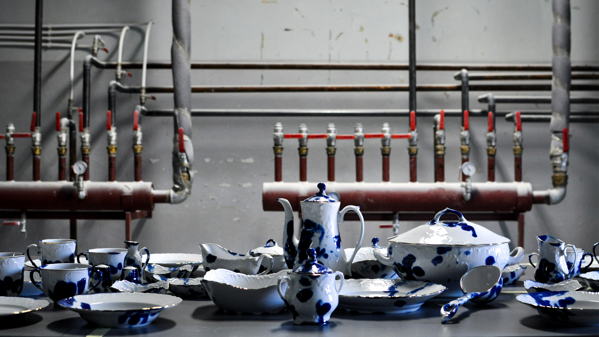 The production line of Poland's oldest porcelain factory has been temporarily sabotaged – so one batch of its traditional tableware is stained blue with factory workers' fingerprints.