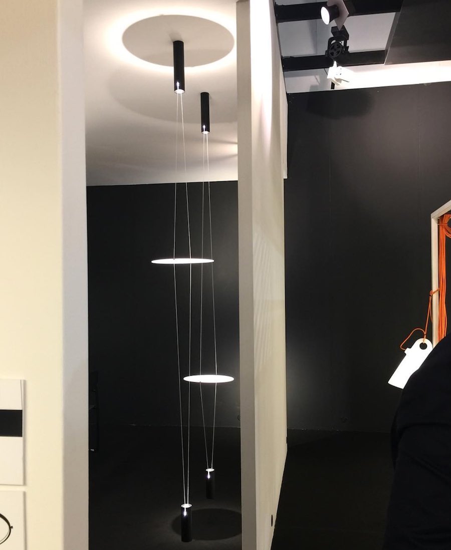 Martinelli Luce launches Coassiale by up-and-coming talent Vittorio Venezia. Two spot LEDs housed inside two black cylinders lamp-holder project on a reflective discfrom above and below. Thanks to cables, the disc can slide vertically to generate different light effects. The upper LED hangs on the ceiling, the lower one is suspended by gravity acting as a counterweight.