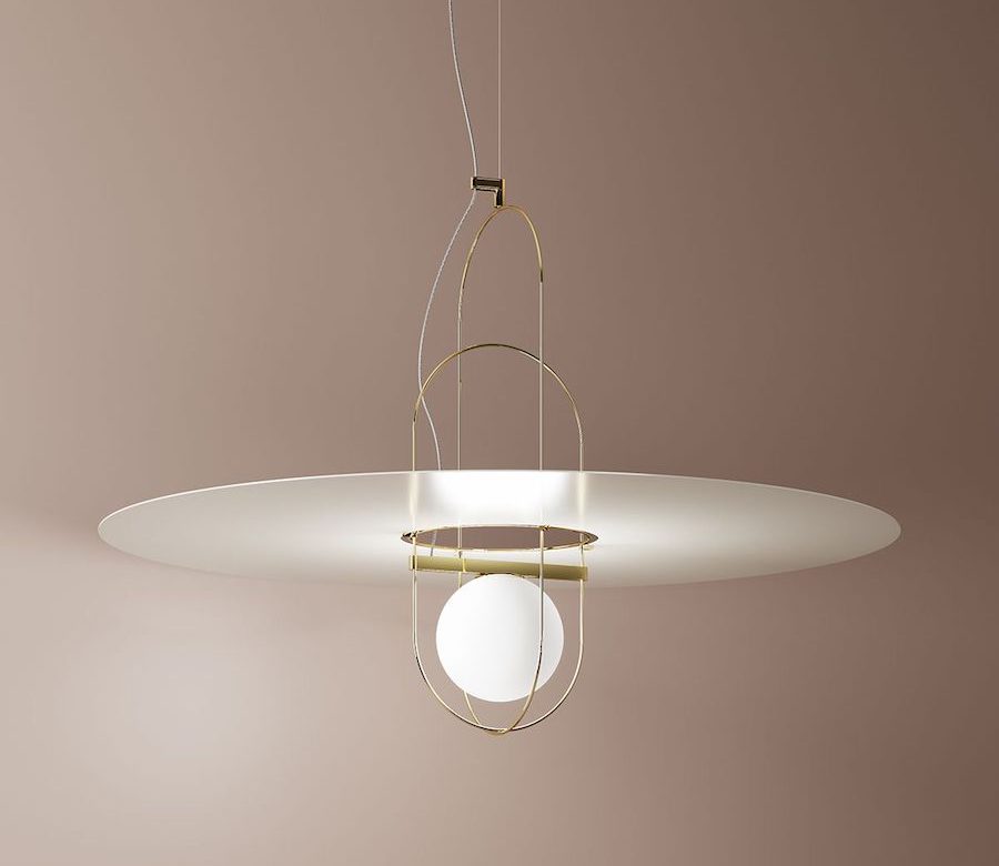 Francesco Librizzi designed Setareh table and suspension lamp for Fontana Arte. The design is composed of a sphere in hand-blown white satin glass, magically suspended within a thin metal structure. The play of circular masses and trajectories generates a balanced design of gravitational dynamics. The light from the sphere is diffused into the surrounding space, illuminating the frame.