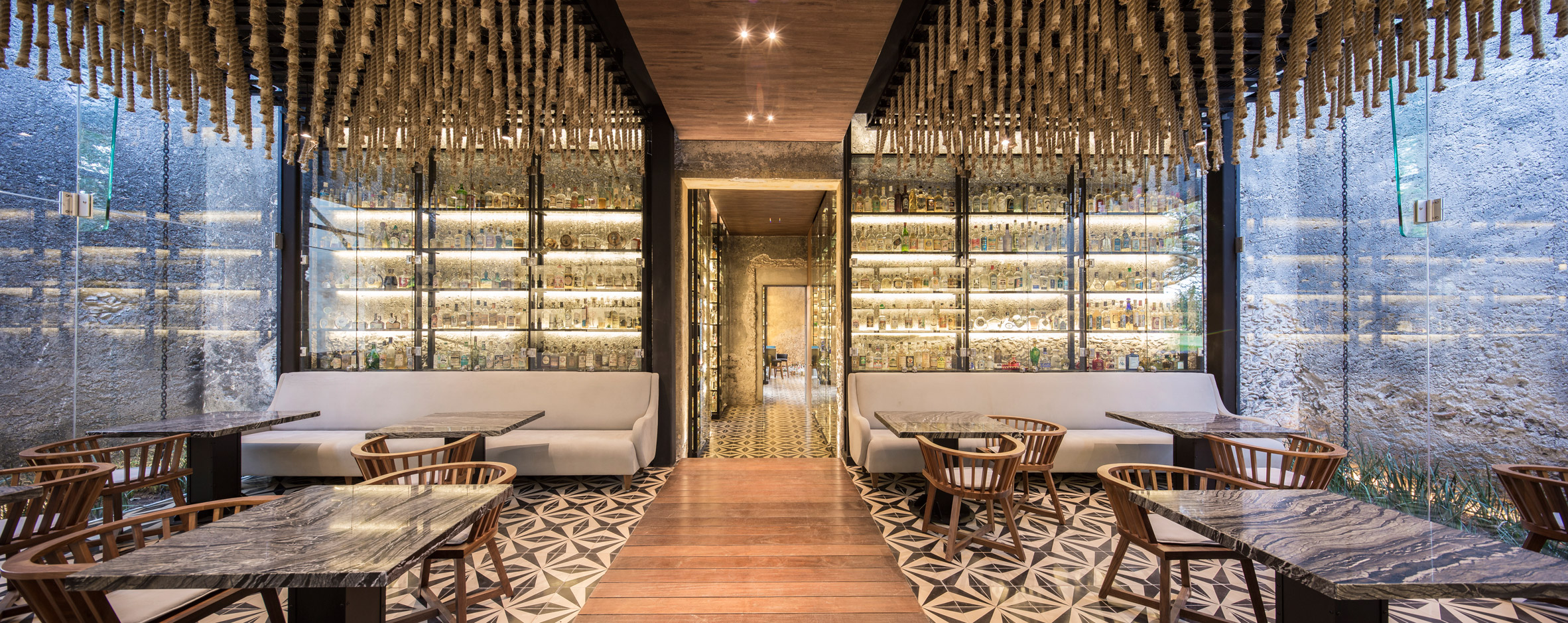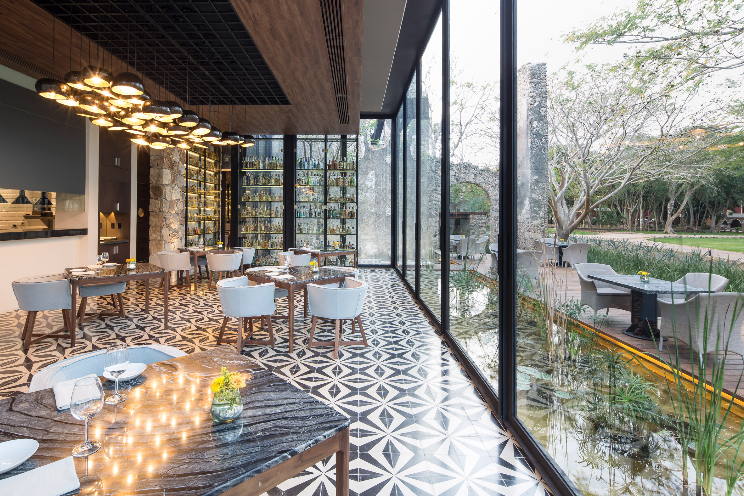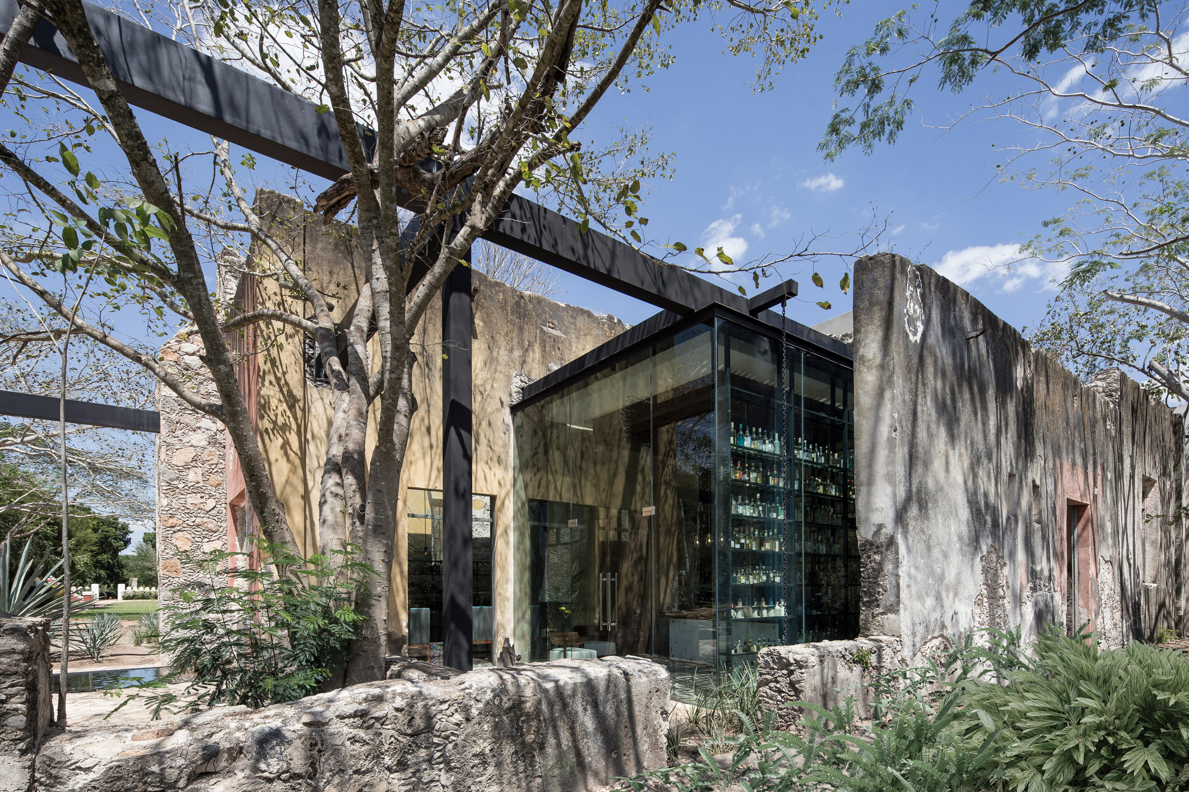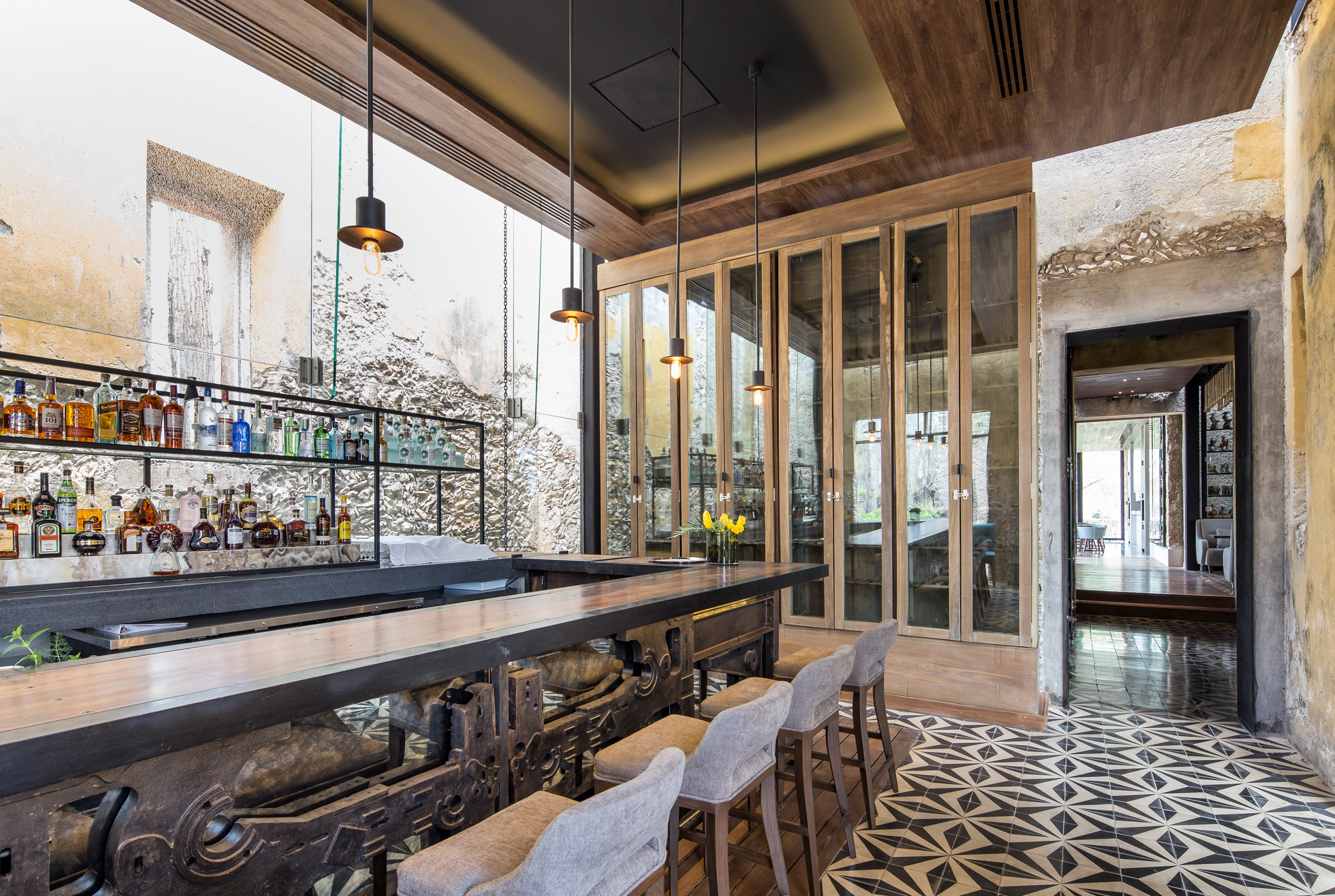 Glazing set into the metal frame offers views into the courtyard framed by old arches. The designers also used floor-to-ceiling glass to expose shelves displaying one of Mexico's largest craft-liquor collections.