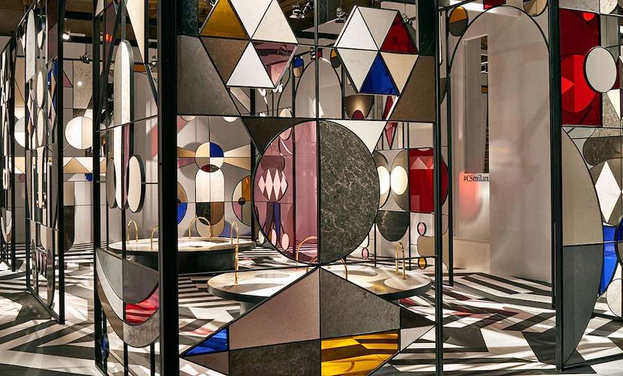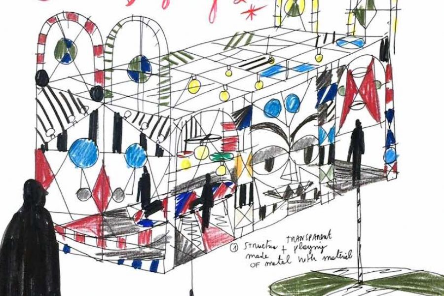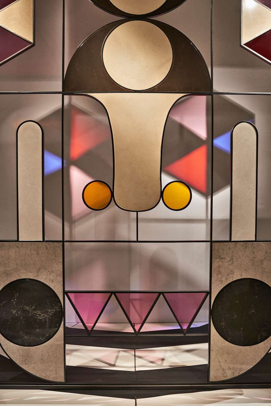 Jaime Hayon worked on Caesarstone’s materials and technologies to experiment with colours and shapes. The result is a pavilion combining glass and 40 different nuances of meticulously handcrafted quartz that have then been implanted into a metal frame to compose fantasy patterns.