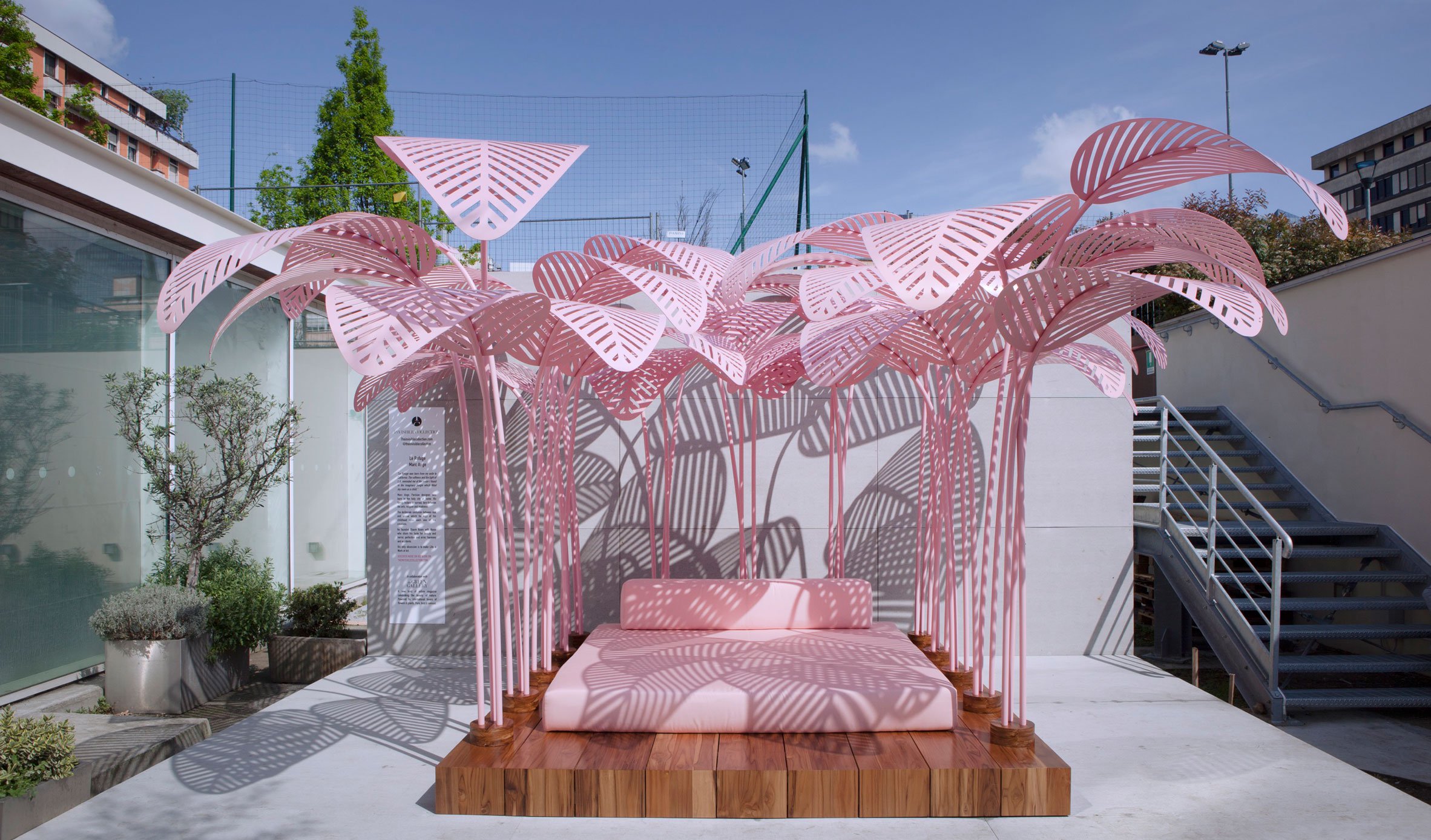 img.1 Designed by Marc Ange, this pink bed and matching leaf canopy became the most Instagrammed installation at Milan design week.