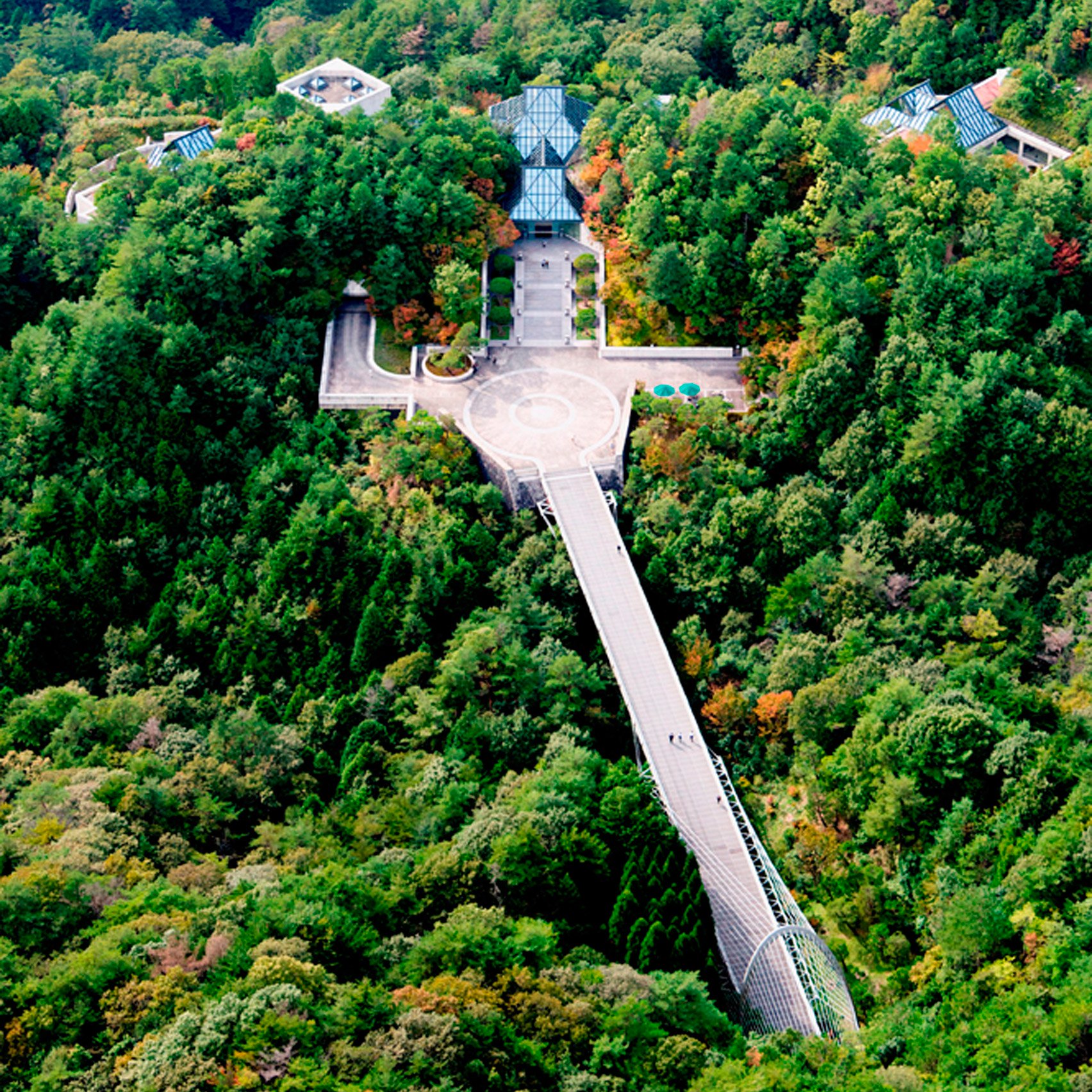 This museum in the mountains outside Kyoto is reached along a tube-shaped tunnel, a walkway bridge and steps up its sloping site – set to host a Louis Vuitton catwalk show later this year.