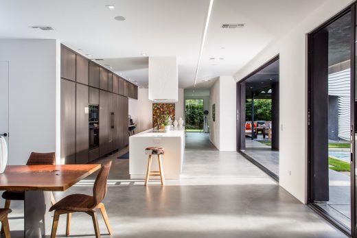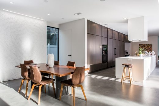 Ornamenting the courtyard wall is an intricate overlapping of “feathers” rising two stories high, keeping the house drier and cooler by allowing more air to circulate. Pitched at 30 degrees, the shadows caste throughout the day are constantly iterating.