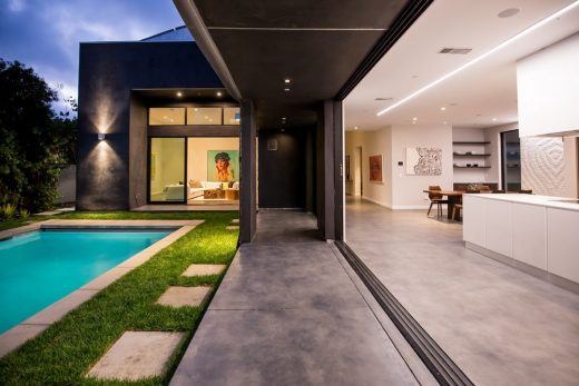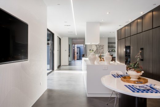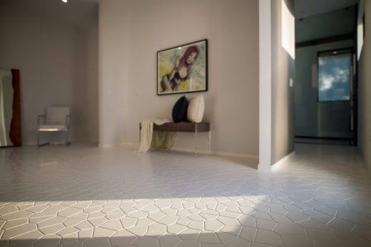 The home’s aluminum skin is skillfully orchestrated, emulating the beauty of nature’s own eloquent geometry. Appearing as if one massive undulating facade, the painted aluminum flows from over two stories high until finally arriving to touch the ground in one single flow. “I wanted to unite the sky and the earth in a single move, an architectural element that no one has ever achieved.”