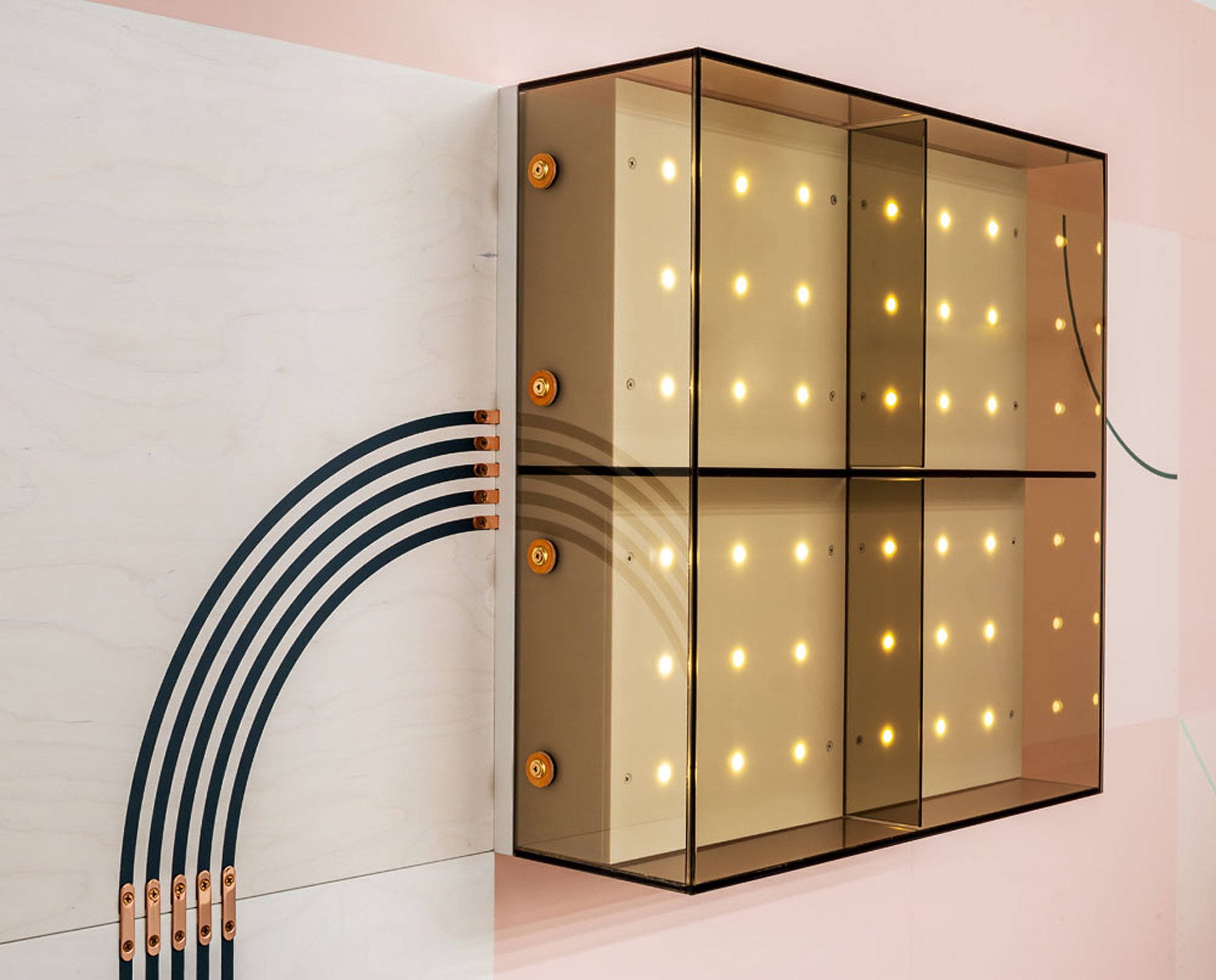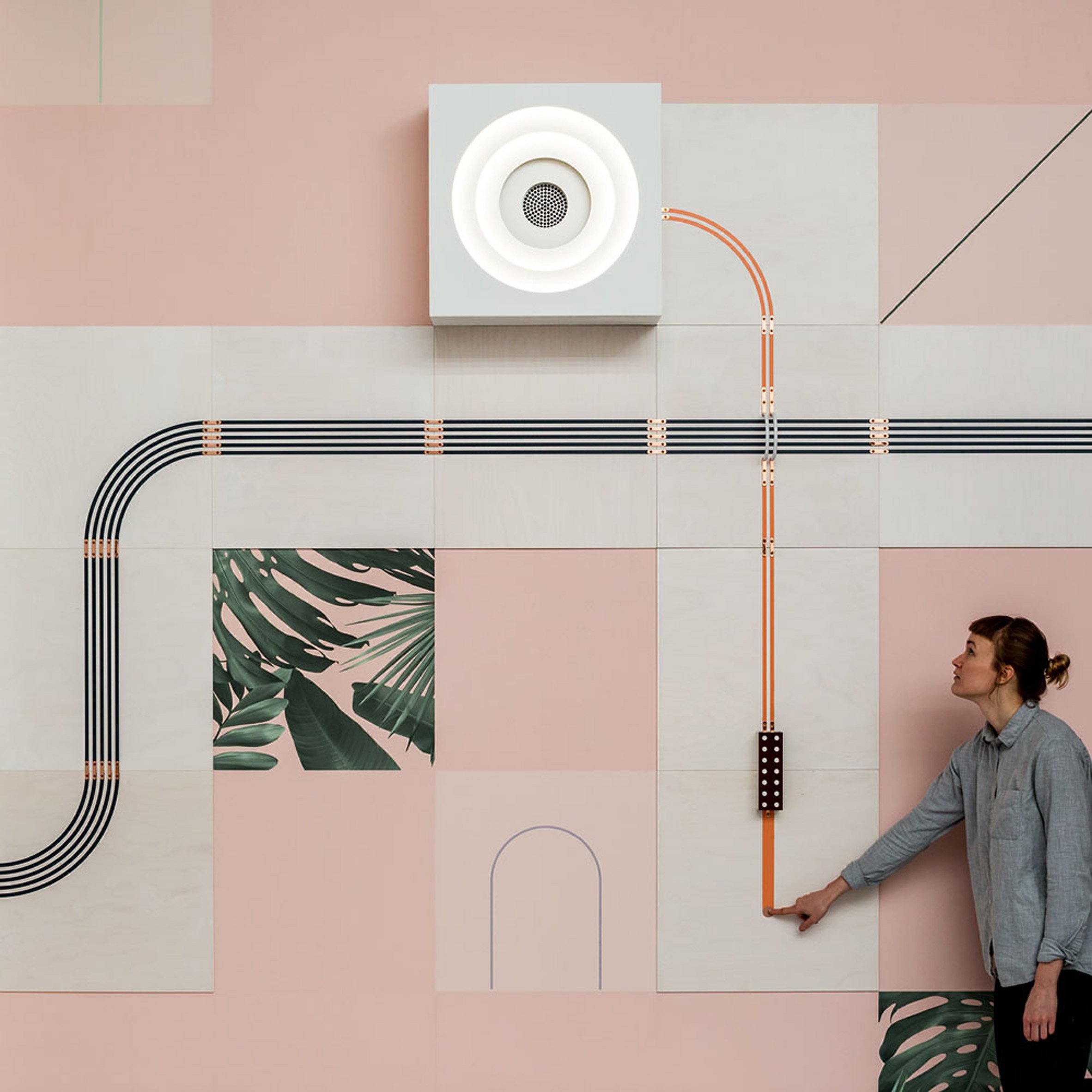 img.0 Lines of conductive ink thread between the protruding speakers and light boxes that form this interactive wall display, designed by UM Project and Flavor Paper.